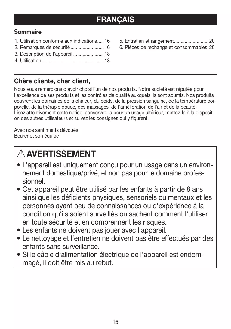 Chère cliente, cher client, Nous vous remercions d‘avoir choisi l‘un de nos produits. Notre société est réputée pour l‘excellence de ses produits et les contrôles de qualité auxquels ils sont soumis. Nos produits couvrent les domaines de la chaleur, du poids, de la pression sanguine, de la température corporelle, de la thérapie douce, des massages, de l’amélioration de l’air et de la beauté. Lisez attentivement cette notice, conservez-la pour un usage ultérieur, mettez-la à la disposition des autres utilisateurs et suivez les consignes qui y figurent. Avec nos sentiments dévoués Beurer et son équipe AVERTISSEMENT