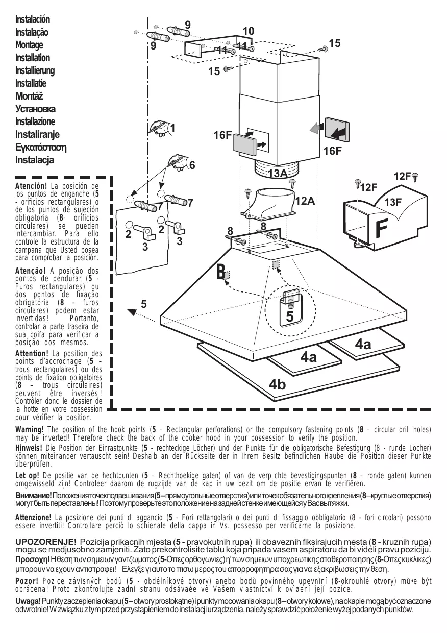 PRESCRIPTIONS DE MONTAGE ET MODE D’EMPLOI Consulter les dessins de la première page avec les références alphabétiques que l’on retrouvera dans le texte explicatif. Suivre strictement les instructions de cette notice. Le constructeur décline toute responsabilité pour tous les inconvenients, dommages ou incendies provoquès à l’appareil et dus à la non observation des instructions de la présente notice. Fonctionnement: La hotte est munie d’un panneau de contrôle situé sur la partie antérieure de la hotte, avec touches ou boutons, selon le type en possession, consulter, pour le fonctionnement, le texte ci-dessous et le dessin correspondant: a. ON/OFF lumières b. OFF moteurs c. - d. - e. Puissance d’aspiration minimum (c.), moyenne (d.), maximum (e.). f. Voyant luminineux de fonctionnement (là où il est prévu) Installation Si vous possédez un plan de cuisson entièrement électrique, la hotte doit etre installée a une distance de 60 cm , de 70 cm dans le cas d’un plan de cuisson mixte ou a gaz. Utilisation La hotte est livrée avec une sortie d’air supérieure B pour l’évacuation des fumées vers l’exterieur sur les modèles pourvus d’une cheminée C (Version aspirante A- tube d’évacuation 13A non compris). S’il est impossible d’évacuer les fumées et vapeurs de cuisson vers l’exterieur, meme si vous etes possesseur d’un modèle avec cheminée C, vous devez utiliser la hotte en version filtrante F en montant deux filtres à charbons actifs E, les fumées et vapeurs seront recyclées et évacuées par la grille supérieure G (selon les modèles, la grille peut etre directement fixée sur la cheminée ou par l’intermediaire de deux petites grilles - 16F ). Si vous possedez un modèle avec la grille fixée directement sur la cheminée vous devez installer deux rallonges H au deflecteur 13F. Les modèles pourvus d’un chapeau D ne peuvent etre utilisés qu’en version filtrante F. Les modèles sans moteur d’aspiration fonctionnent seulement en version aspirante et doivent etre reliés à une unité d’aspiration extérieure (non fournie). Branchement électrique La tension du réseau doit correspondre à la tension indiquée sur l’étiquette des caractéristiques située dans la hotte. Si la hotte est fournie avec une fiche, la raccorder à une prise accessible conforme aux normes en vigueur. Si la hotte est fournie sans fiche ( branchement direct sur le réseau), la raccorder à un interrupteur bipolaire normalisé ayant une distance des contacts supérieure à 3 mm (accessible).