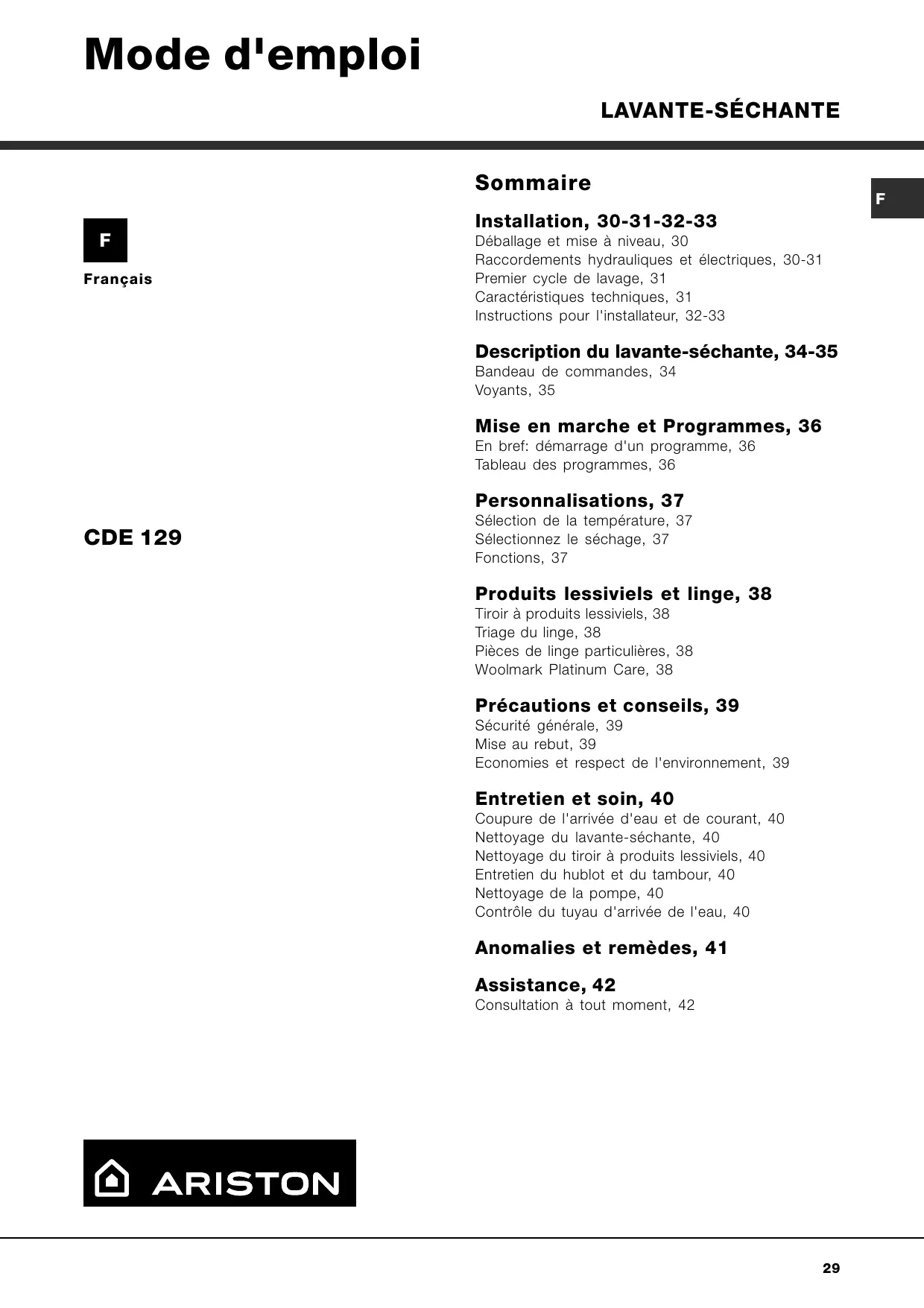 Installation, 30-31-32-33 Déballage et mise à niveau, 30 Raccordements hydrauliques et électriques, 30-31 Premier cycle de lavage, 31 Caractéristiques techniques, 31 Instructions pour l'installateur, 32-33 Description du lavante-séchante, 34-35 Bandeau de commandes, 34 Voyants, 35 Mise en marche et Programmes, 36 En bref: démarrage d'un programme, 36 Tableau des programmes, 36 Personnalisations, 37 CDE 129 Sélection de la température, 37 Sélectionnez le séchage, 37 Fonctions, 37 Produits lessiviels et linge, 38 Tiroir à produits lessiviels, 38 Triage du linge, 38 Pièces de linge particulières, 38 Woolmark Platinum Care, 38 Précautions et conseils, 39 Sécurité générale, 39 Mise au rebut, 39 Economies et respect de l'environnement, 39 Entretien et soin, 40 Coupure de l'arrivée d'eau et de courant, 40 Nettoyage du lavante-séchante, 40 Nettoyage du tiroir à produits lessiviels, 40 Entretien du hublot et du tambour, 40 Nettoyage de la pompe, 40 Contrôle du tuyau d'arrivée de l'eau, 40 Anomalies et remèdes, 41 Assistance, 42 Consultation à tout moment, 42