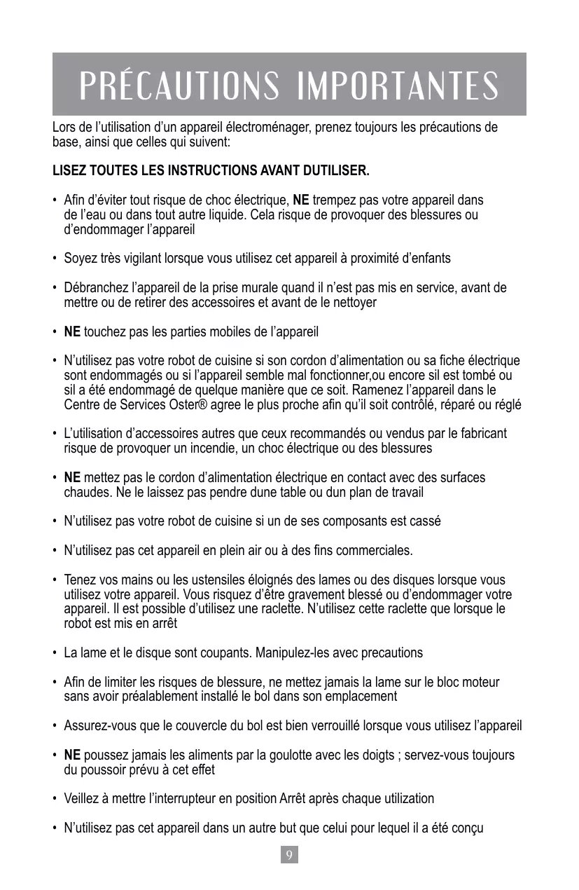 LEIA TODAS AS INSTRUÇÕES ANTES DE USAR ESTE APARELHO BETRIEBSANLEITUNG KÜCHENMASCHINE DIE BEDIENUNGSANLEITUNG VOR DER NUTZUNG BITTE VOLLSTÄNDIG LESEN PR É C A U TI O N S I M P ORTAN TES Lors de l’utilisation d’un appareil électroménager, prenez toujours les précautions de base, ainsi que celles qui suivent: LISEZ TOUTES LES INSTRUCTIONS AVANT DUTILISER. • Afin d’éviter tout risque de choc électrique, ne trempez pas votre appareil dans de l’eau ou dans tout autre liquide. Cela risque de provoquer des blessures ou d’endommager l’appareil • Soyez très vigilant lorsque vous utilisez cet appareil à proximité d’enfants • Débranchez l’appareil de la prise murale quand il n’est pas mis en service, avant de mettre ou de retirer des accessoires et avant de le nettoyer • Ne touchez pas les parties mobiles de l’appareil • N’utilisez pas votre robot de cuisine si son cordon d’alimentation ou sa fiche électrique sont endommagés ou si l’appareil semble mal fonctionner,ou encore sil est tombé ou sil a été endommagé de quelque manière que ce soit. Ramenez l’appareil dans le Centre de Services Oster® agree le plus proche afin qu’il soit contrôlé, réparé ou réglé • L’utilisation d’accessoires autres que ceux recommandés ou vendus par le fabricant risque de provoquer un incendie, un choc électrique ou des blessures • Ne mettez pas le cordon d’alimentation électrique en contact avec des surfaces chaudes. Ne le laissez pas pendre dune table ou dun plan de travail • N’utilisez pas votre robot de cuisine si un de ses composants est cassé • N’utilisez pas cet appareil en plein air ou à des fins commerciales. • Tenez vos mains ou les ustensiles éloignés des lames ou des disques lorsque vous utilisez votre appareil. Vous risquez d’être gravement blessé ou d’endommager votre appareil. Il est possible d’utilisez une raclette. N’utilisez cette raclette que lorsque le robot est mis en arrêt • La lame et le disque sont coupants. Manipulez-les avec precautions • Afin de limiter les risques de blessure, ne mettez jamais la lame sur le bloc moteur sans avoir préalablement installé le bol dans son emplacement • Assurez-vous que le couvercle du bol est bien verrouillé lorsque vous utilisez l’appareil • Ne poussez jamais les aliments par la goulotte avec les doigts ; servez-vous toujours du poussoir prévu à cet effet • Veillez à mettre l’interrupteur en position Arrêt après chaque utilization • N’utilisez pas cet appareil dans un autre but que celui pour lequel il a été conçu 9