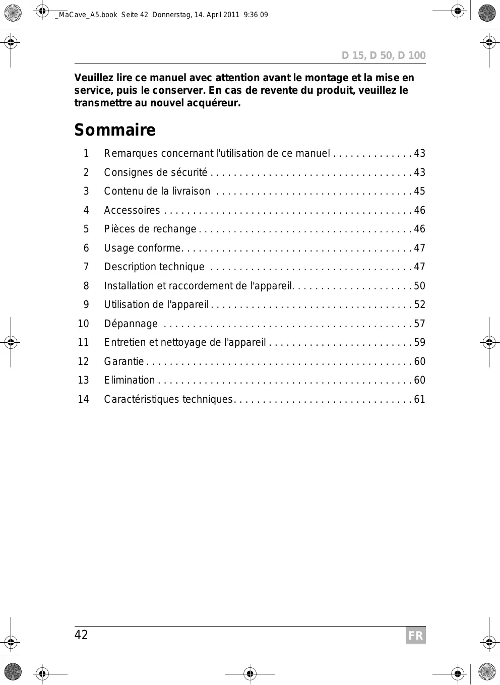 _MaCave_A5.book Seite 42 Donnerstag, 14. April 2011 9:36 09 D 15, D 50, D 100 Veuillez lire ce manuel avec attention avant le montage et la mise en service, puis le conserver. En cas de revente du produit, veuillez le transmettre au nouvel acquéreur. Sommaire