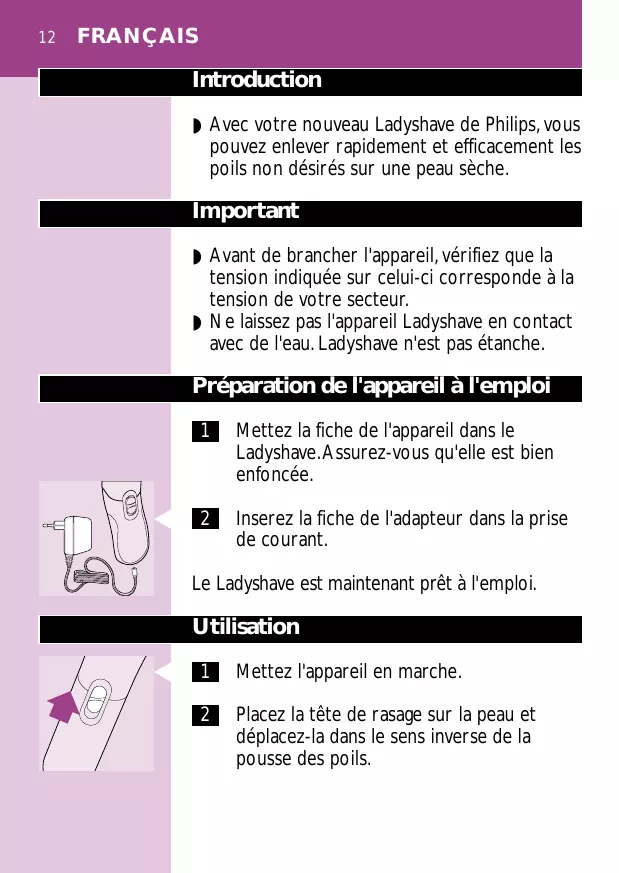 ◗ Ne laissez pas l'appareil Ladyshave en contact avec de l'eau. Ladyshave n'est pas étanche.