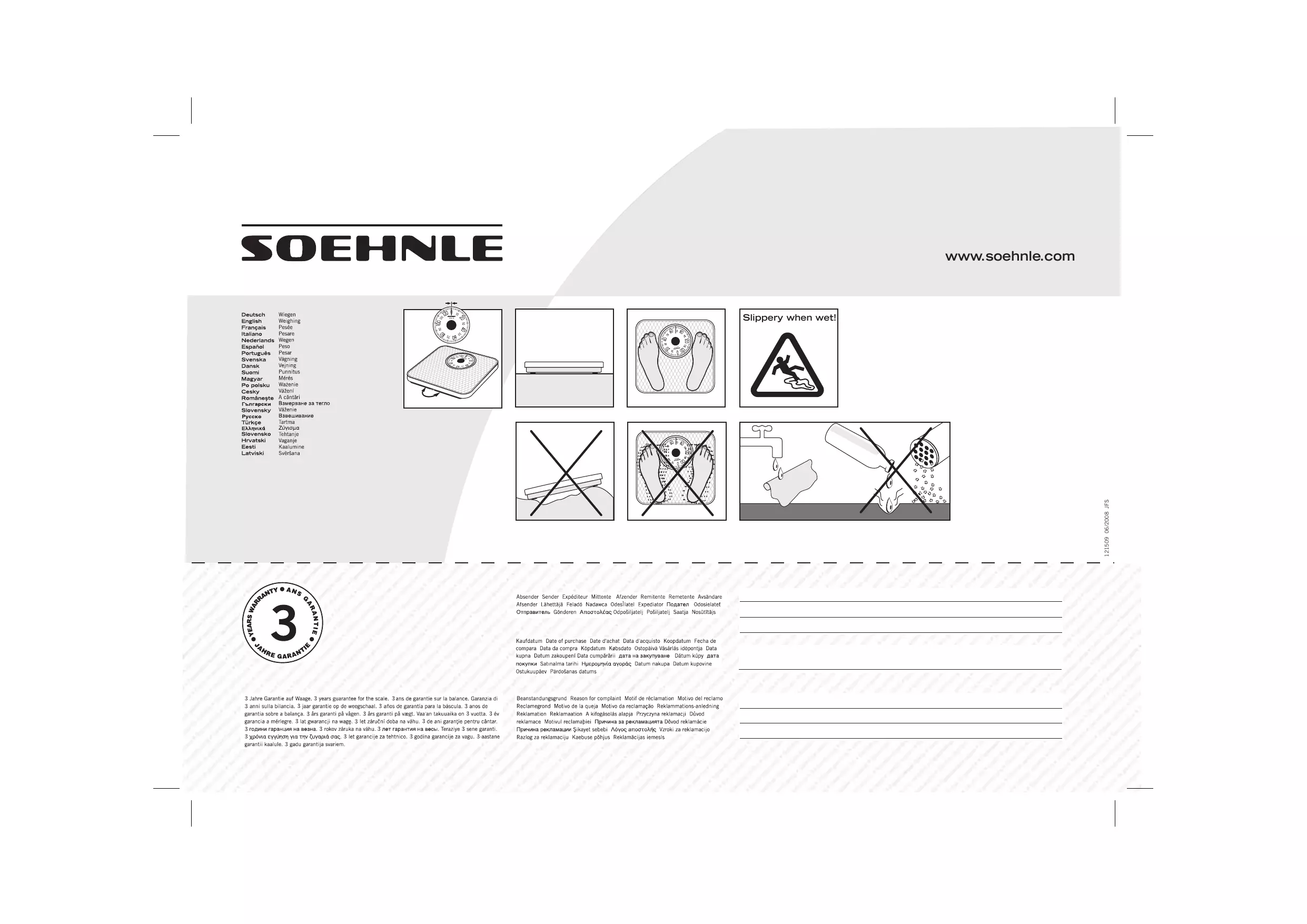 Soehnle garantit l'élimination gratuite des defaults provenant de vices de matériel ou de fabrication par réparation ou échange pour une durée de 3 ans à compter de la date d'achat. Lors de l'achat, veilleux demander à votre commercant de replir le bon de garantie et d'y apposer son timbre. En cas de garantie, prière de returner à votre revendeur la balance avec le bon de garantie.