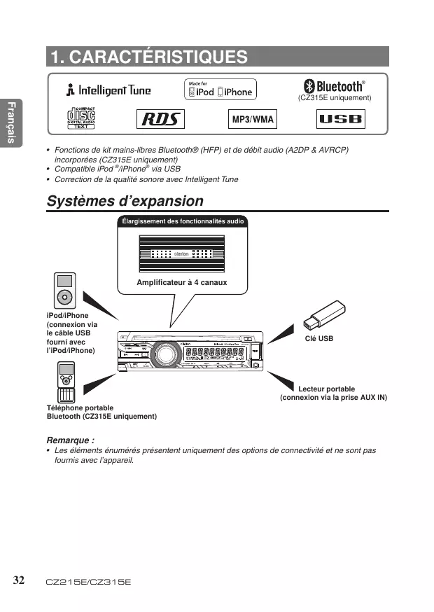 - CorrectiondelaqualitésonoreavecIntelligentTune Systèmes d’expansion Élargissement des fonctionnalités audio Amplificateur à 4 canaux iPod/iPhone (connexion via le câble USB fourni avec l’iPod/iPhone) Clé USB Lecteur portable (connexion via la prise AUX IN) Téléphone portable Bluetooth (CZ315E uniquement) Remarque :