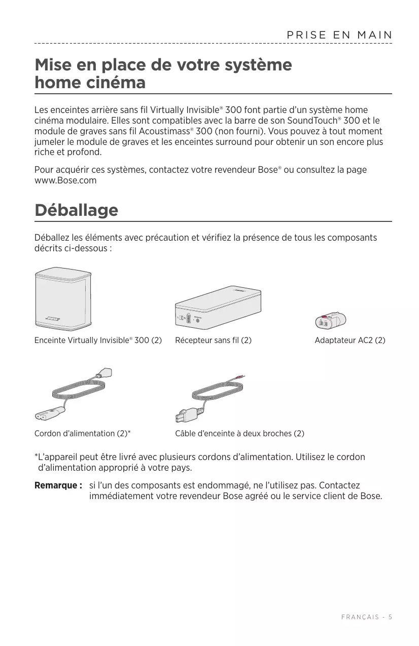 Mise en place de votre système home cinéma Les enceintes arrière sans fil Virtually Invisible® 300 font partie d’un système home cinéma modulaire. Elles sont compatibles avec la barre de son SoundTouch® 300 et le module de graves sans fil Acoustimass® 300 (non fourni). Vous pouvez à tout moment jumeler le module de graves et les enceintes surround pour obtenir un son encore plus riche et profond. Pour acquérir ces systèmes, contactez votre revendeur Bose® ou consultez la page www.Bose.com Déballage Déballez les éléments avec précaution et vérifiez la présence de tous les composants décrits ci-dessous : Enceinte Virtually Invisible® 300 (2) Récepteur sans fil (2) Cordon d’alimentation (2)* Câble d’enceinte à deux broches (2) Adaptateur AC2 (2) *L’appareil peut être livré avec plusieurs cordons d’alimentation. Utilisez le cordon d’alimentation approprié à votre pays. Remarque : si l’un des composants est endommagé, ne l’utilisez pas. Contactez immédiatement votre revendeur Bose agréé ou le service client de Bose.
