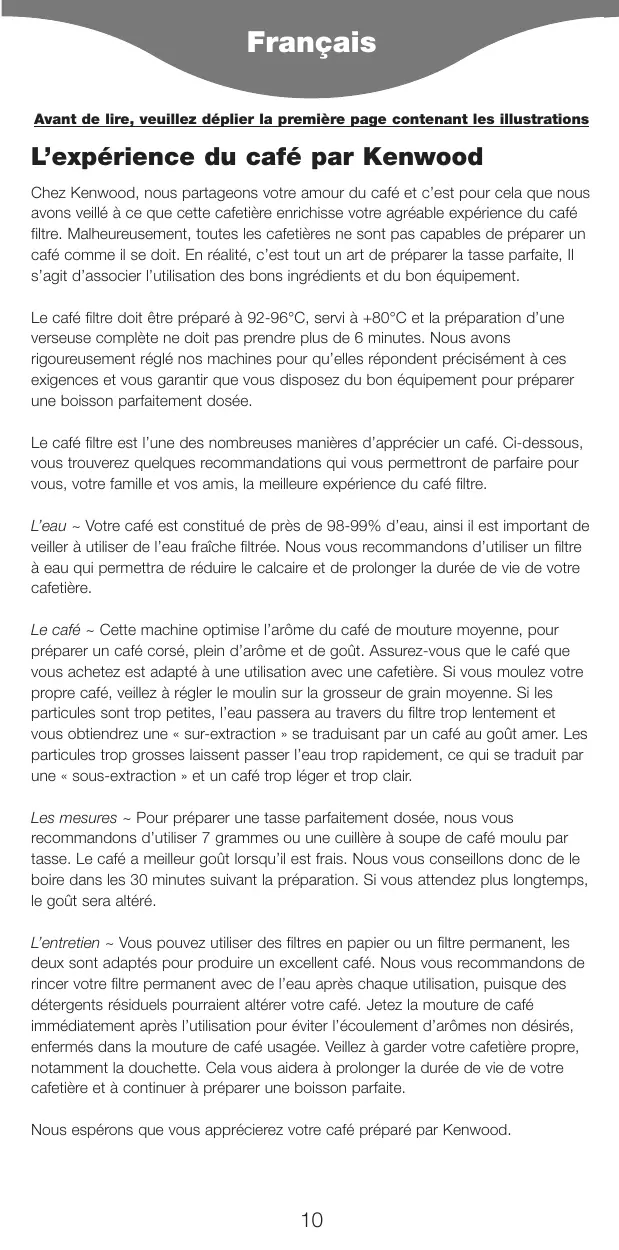 Français Avant de lire, veuillez déplier la première page contenant les illustrations L’expérience du café par Kenwood Chez Kenwood, nous partageons votre amour du café et c’est pour cela que nous avons veillé à ce que cette cafetière enrichisse votre agréable expérience du café filtre. Malheureusement, toutes les cafetières ne sont pas capables de préparer un café comme il se doit. En réalité, c’est tout un art de préparer la tasse parfaite, Il s’agit d’associer l’utilisation des bons ingrédients et du bon équipement. Le café filtre doit être préparé à 92-96°C, servi à +80°C et la préparation d’une verseuse complète ne doit pas prendre plus de 6 minutes. Nous avons rigoureusement réglé nos machines pour qu’elles répondent précisément à ces exigences et vous garantir que vous disposez du bon équipement pour préparer une boisson parfaitement dosée. Le café filtre est l’une des nombreuses manières d’apprécier un café. Ci-dessous, vous trouverez quelques recommandations qui vous permettront de parfaire pour vous, votre famille et vos amis, la meilleure expérience du café filtre. L’eau ~ Votre café est constitué de près de 98-99% d’eau, ainsi il est important de veiller à utiliser de l’eau fraîche filtrée. Nous vous recommandons d’utiliser un filtre à eau qui permettra de réduire le calcaire et de prolonger la durée de vie de votre cafetière. Le café ~ Cette machine optimise l’arôme du café de mouture moyenne, pour préparer un café corsé, plein d’arôme et de goût. Assurez-vous que le café que vous achetez est adapté à une utilisation avec une cafetière. Si vous moulez votre propre café, veillez à régler le moulin sur la grosseur de grain moyenne. Si les particules sont trop petites, l’eau passera au travers du filtre trop lentement et vous obtiendrez une « sur-extraction » se traduisant par un café au goût amer. Les particules trop grosses laissent passer l’eau trop rapidement, ce qui se traduit par une « sous-extraction » et un café trop léger et trop clair. Les mesures ~ Pour préparer une tasse parfaitement dosée, nous vous recommandons d’utiliser 7 grammes ou une cuillère à soupe de café moulu par tasse. Le café a meilleur goût lorsqu’il est frais. Nous vous conseillons donc de le boire dans les 30 minutes suivant la préparation. Si vous attendez plus longtemps, le goût sera altéré. L’entretien ~ Vous pouvez utiliser des filtres en papier ou un filtre permanent, les deux sont adaptés pour produire un excellent café. Nous vous recommandons de rincer votre filtre permanent avec de l’eau après chaque utilisation, puisque des détergents résiduels pourraient altérer votre café. Jetez la mouture de café immédiatement après l’utilisation pour éviter l’écoulement d’arômes non désirés, enfermés dans la mouture de café usagée. Veillez à garder votre cafetière propre, notamment la douchette. Cela vous aidera à prolonger la durée de vie de votre cafetière et à continuer à préparer une boisson parfaite. Nous espérons que vous apprécierez votre café préparé par Kenwood.