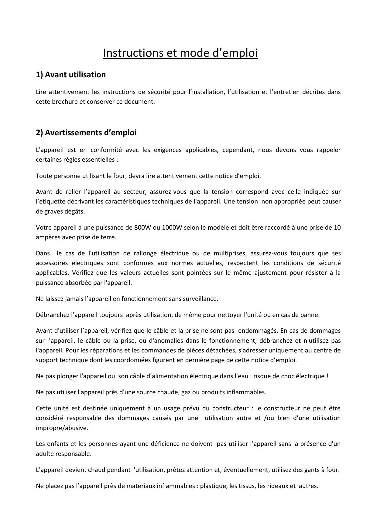L’appareil est en conformité avec les exigences applicables, cependant, nous devons vous rappeler certaines règles essentielles : Toute personne utilisant le four, devra lire attentivement cette notice d’emploi. Avant de relier l’appareil au secteur, assurez-vous que la tension correspond avec celle indiquée sur l’étiquette décrivant les caractéristiques techniques de l'appareil. Une tension non appropriée peut causer de graves dégâts. Votre appareil a une puissance de 800W ou 1000W selon le modèle et doit être raccordé à une prise de 10 ampères avec prise de terre. Dans le cas de l'utilisation de rallonge électrique ou de multiprises, assurez-vous toujours que ses accessoires électriques sont conformes aux normes actuelles, respectent les conditions de sécurité applicables. Vérifiez que les valeurs actuelles sont pointées sur le même ajustement pour résister à la puissance absorbée par l'appareil. Ne laissez jamais l’appareil en fonctionnement sans surveillance. Débranchez l’appareil toujours après utilisation, de même pour nettoyer l'unité ou en cas de panne. Avant d'utiliser l’appareil, vérifiez que le câble et la prise ne sont pas endommagés. En cas de dommages sur l’appareil, le câble ou la prise, ou d'anomalies dans le fonctionnement, débranchez et n'utilisez pas l'appareil. Pour les réparations et les commandes de pièces détachées, s'adresser uniquement au centre de support technique dont les coordonnées figurent en dernière page de cette notice d’emploi. Ne pas plonger l'appareil ou son câble d’alimentation électrique dans l'eau : risque de choc électrique ! Ne pas utiliser l'appareil près d'une source chaude, gaz ou produits inflammables. Cette unité est destinée uniquement à un usage prévu du constructeur : le constructeur ne peut être considéré responsable des dommages causés par une utilisation autre et /ou bien d’une utilisation impropre/abusive. Les enfants et les personnes ayant une déficience ne doivent pas utiliser l’appareil sans la présence d'un adulte responsable. L’appareil devient chaud pendant l'utilisation, prêtez attention et, éventuellement, utilisez des gants à four. Ne placez pas l’appareil près de matériaux inflammables : plastique, les tissus, les rideaux et autres. Faire attention que le câble n'entre jamais en contact avec une partie quelconque chaude de l’appareil. Débranchez le câble de réseau de la prise de courant, saisir et débrancher, ne tirer jamais sur le câble ! Ne pas utiliser l’appareil près de source d’eau ou en présence d'humidité.