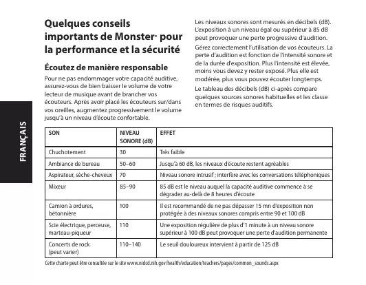Une exposition régulière de plus d’1 minute à un niveau sonore supérieur à 100 dB peut provoquer une perte d’audition permanente Concerts de rock (peut varier) 110–140 Le seuil douloureux intervient à partir de 125 dB Cette charte peut être consultée sur le site www.nidcd.nih.gov/health/education/teachers/pages/common_sounds.aspx Tirez le meilleur de votre équipement et profitez d’une performance sonore exceptionnelle, même à des niveaux respectant la sécurité. Nos écouteurs vous permettront de percevoir plus de détails que jamais, y compris à faible volume. Physiologie de l’oreille et du système auditif Enclume Nerf auditif Marteau Cochlée Conduit auditif Tympan Vestibule Étrier Vers le nez/la gorge For additional information on what loud noises do to your ear and more on protecting the ear, reference www.abelard.org/hear/hear. php#loud-music N’utilisez pas vos écouteurs lorsqu’il est imprudent de le faire – quand vous conduisez , lorsque vous êtes à bicyclette ou que vous traversez une rue, durant une activité ou dans un environnement exigeant toute votre attention. Il est dangereux de conduire tout en portant des écouteurs. Cela est même illégal en de nombreux endroits, dès lors que cela peut vous empêcher d’entendre des signaux sonores extérieurs qui peuvent vous sauver la vie comme, par exemple, l’avertisseur d’une autre voiture ou la sirène d’un véhicule d’urgence. Veuillez à ne pas porter vos écouteurs lorsque vous conduisez. Pour écouter vos lecteurs portables, utilisez plutôt l’un des récepteurs FM de Monster. Rodage des casques Un temps de rodage pour les casques ? C’est une plaisanterie, n’est-ce pas ? Non, ce n’en est pas une. Comme tout produit de haute performance, qu’il s’agisse de voitures ou de casques, ce sont des appareils mécaniques qui se perfectionnent après utilisation. Le son de votre nouveau casque sera d’excellente qualité dès la sortie de l’emballage, mais il s’« adoucira » après utilisation et sera encore meilleur. Nous vous recommandons d’utiliser votre casque pendant 8 heures. Après 20 heures FRANÇAIS Apprenez à définir les niveaux d’une écoute sans danger et consultez d’autres consignes de sécurité importantes proposées par la Consumer Electronics Association sur le site www.ce.org. D’importantes informations sur la manière de prévenir la perte d’audition due au bruit, ainsi qu’une liste complète des sources sonores susceptibles de provoquer ce type de dommage, peuvent être consultées sur le site de la Deafness Research Foundation’s website, www.drf.org. Utilisez vos écouteurs de manière responsable d’utilisation, il devrait être complètement rodé. Profitez ! Batterie FRANÇAIS Lorsque c’est possible, les batteries doivent être recyclées ou jetées en veillant à respecter l’environnement. Informations destinées aux consommateurs conformément à la Directive Européenne 96/2002 concernant les Déchets d’Équipements Électriques et Électroniques (DEEE) Ce produit est soumis aux règles en vigueur dans l’Union Européenne promouvant la réutilisation et le recyclage des déchets d’équipements électriques et électroniques. Ce produit a requis l’extraction et l’utilisation de ressources naturelles et peut contenir des substances dangereuses. Le symbole ci-dessus, apposé sur le produit ou sur son emballage, indique que ce produit ne peut être jeter avec votre déchet ménager. Au contraire, il est de votre responsabilité de traiter vos déchets d’équipements en les remettant à un centre de collecte des déchets chargé du recyclage des déchets d’équipements électriques et électroniques. La reprise et le recyclage séparés de vos déchets d’équipements au moment de la mise au rebut aideront à conserver les ressources naturelles et à assurer qu’ils soient recyclés d’une manière protégeant la santé publique et l’environnement. Pour obtenir de plus amples informations au sujet de l’endroit de reprise et de collecte de vos déchets d’équipements pour le recyclage, veuillez vous adresser au bureau compétent de votre commune, à la société de collecte des déchets ou directement auprès du magasin où vous avez acheté le produit en question. Pour obtenir de plus amples informations sur les produits Monster, veuillez visiter notre site à l’adresse suivante: www.MonsterProducts.com. Service Monster® Un problème avec vos écouteurs ? Notre équipe du service clients est là pour vous aider. Veuillez ne pas retourner le casque à votre revendeur, APPELEZ notre centre de service client au 1-877-800-8989 aux États-Unis ou en Amérique Latine ou envoyez-nous un e-mail à l’adresse www.MonsterProducts.com/service/. Pour obtenir le numéro du service client au Canada, en Europe et en Asian Pacific, veuillez consulter la section « Numéros de téléphone » dans le paragraphe suivant « garantie limitée pour le consommateur ». Notre équipe d’experts vous assistera pour toute question et difficulté technique. Nous sommes là pour nos produits. Les écouteurs Monster offrent ce qu’il y a de mieux en termes de son, de qualité et de conception. Merci pour votre achat. Visit MonsterProducts.com/ headphones to order headphone replacement parts, accessories, and cables. Téléchargez le manuel complet sur : www.MonsterProducts.com Monster, LLC, 7251 West Lake Mead Blvd., Las Vegas, NV 89128, ÉTATS-UNIS, [VEUILLEZ NOTER