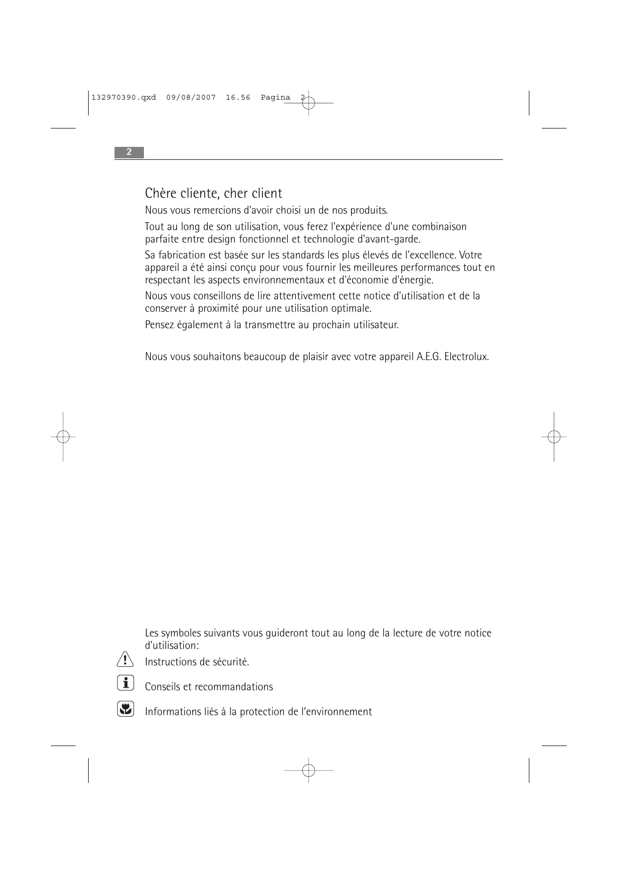 Chère cliente, cher client Nous vous remercions d'avoir choisi un de nos produits. Tout au long de son utilisation, vous ferez l'expérience d'une combinaison parfaite entre design fonctionnel et technologie d'avant-garde. Sa fabrication est basée sur les standards les plus élevés de l'excellence. Votre appareil a été ainsi conçu pour vous fournir les meilleures performances tout en respectant les aspects environnementaux et d'économie d'énergie. Nous vous conseillons de lire attentivement cette notice d'utilisation et de la conserver à proximité pour une utilisation optimale. Pensez également à la transmettre au prochain utilisateur. Nous vous souhaitons beaucoup de plaisir avec votre appareil A.E.G. Electrolux. Les symboles suivants vous guideront tout au long de la lecture de votre notice d'utilisation: Instructions de sécurité. Conseils et recommandations Informations liés à la protection de l’environnement 132970390.qxd 09/08/2007