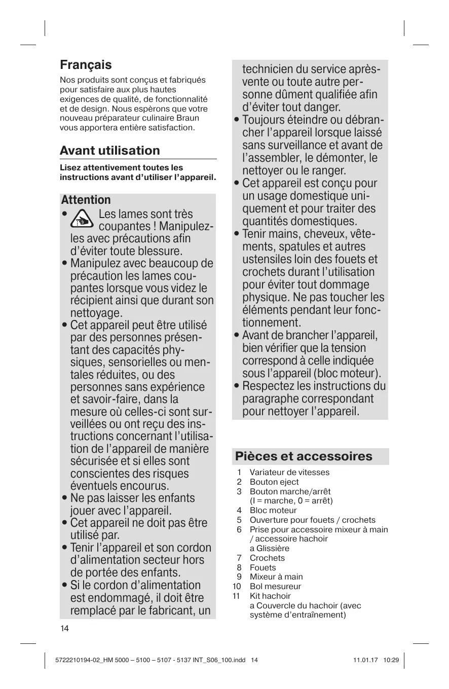 Français Nos produits sont conçus et fabriqués pour satisfaire aux plus hautes exigences de qualité, de fonctionnalité et de design. Nous espèrons que votre nouveau préparateur culinaire Braun vous apportera entière satisfaction. Avant utilisation Lisez attentivement toutes les instructions avant d’utiliser l’appareil. Attention Les lames sont très coupantes ! Manipulezles avec précautions afin d’éviter toute blessure.