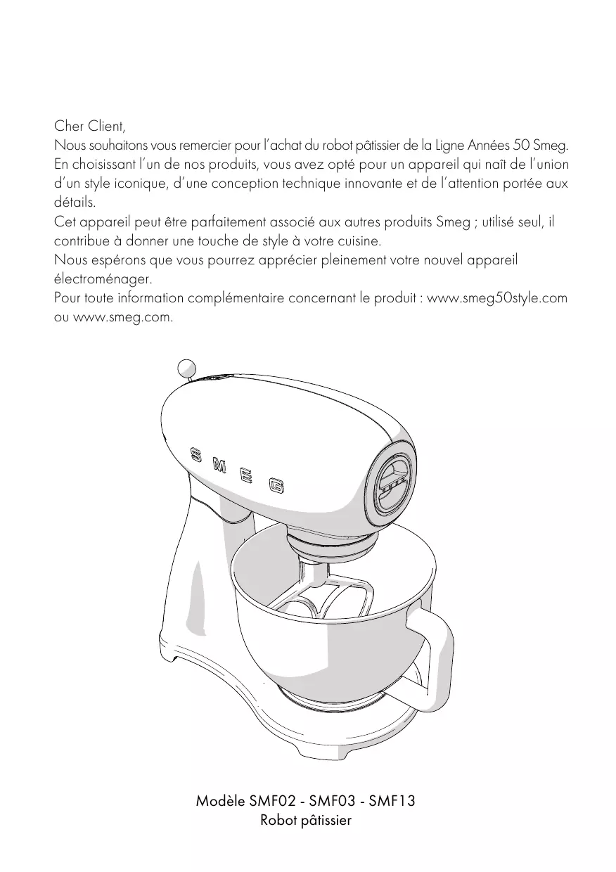 En choisissant l’un de nos produits, vous avez opté pour un appareil qui naît de l’union d’un style iconique, d’une conception technique innovante et de l’attention portée aux détails. Cet appareil peut être parfaitement associé aux autres produits Smeg ; utilisé seul, il contribue à donner une touche de style à votre cuisine. Nous espérons que vous pourrez apprécier pleinement votre nouvel appareil électroménager. Pour toute information complémentaire concernant le produit : www.smeg50style.com ou www.smeg.com.