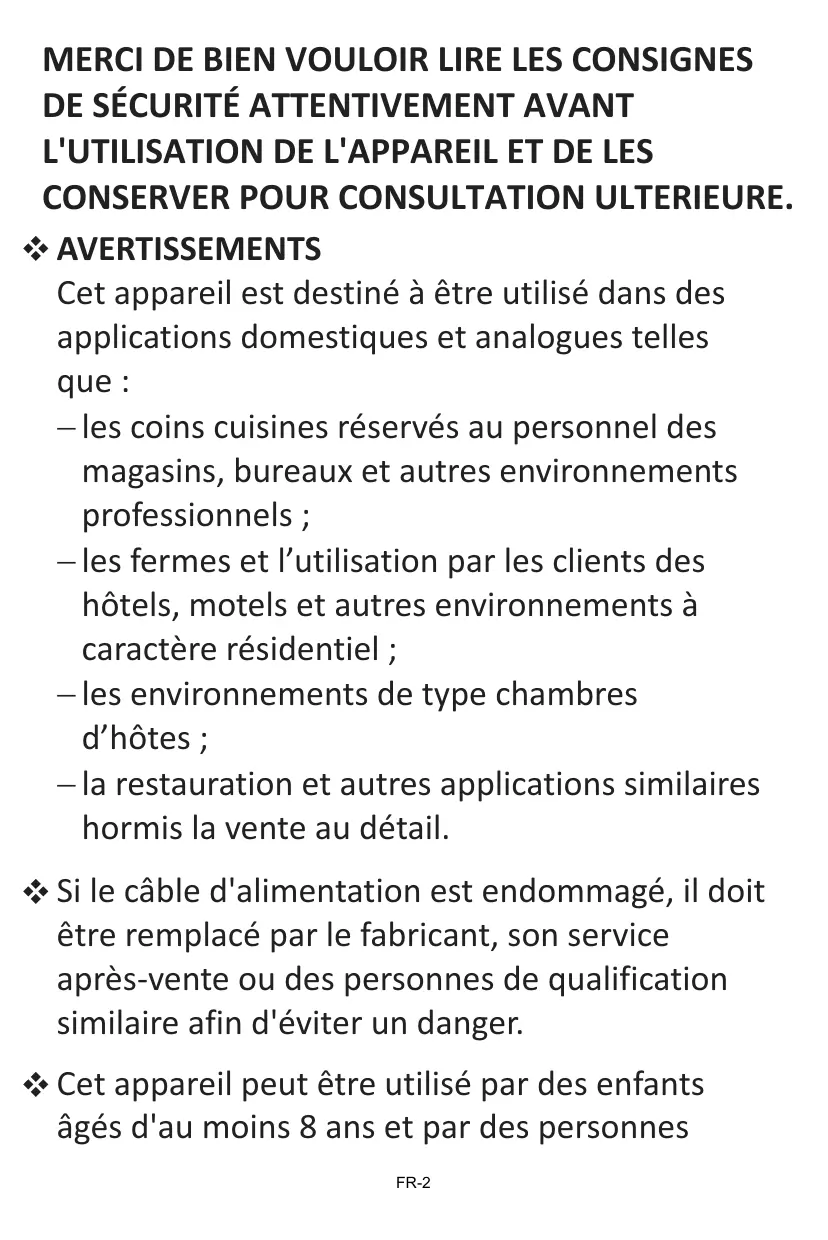 CONSERVER POUR CONSULTATION ULTERIEURE. AVERTISSEMENTS Cet appareil est destiné à être utilisé dans des applications domestiques et analogues telles que : les coins cuisines réservés au personnel des magasins, bureaux et autres environnements professionnels ; les fermes et l’utilisation par les clients des hôtels, motels et autres environnements à caractère résidentiel ; les environnements de type chambres d’hôtes ; la restauration et autres applications similaires hormis la vente au détail. Si le câble d'alimentation est endommagé, il doit être remplacé par le fabricant, son service après-vente ou des personnes de qualification similaire afin d'éviter un danger. Cet appareil peut être utilisé par des enfants âgés d'au moins 8 ans et par des personnes FR-2 ayant des capacités physiques, sensorielles ou mentales réduites ou dénuées d’expérience ou de connaissance, s'ils (si elles) sont correctement surveillé(e)s ou si des instructions relatives à l'utilisation de l'appareil en toute sécurité leur ont été données et si les risques encourus ont été appréhendés. Les enfants ne doivent pas jouer avec l’appareil. Le nettoyage et l'entretien par l'usager ne doivent pas être effectués par des enfants sans surveillance. En ce qui concerne les informations détaillées sur la manière de nettoyer les surfaces en contact avec les aliments et les surfaces pouvant être éclaboussées , référez-vous dans la section “NETTOYAGE ET ENTRETIEN” en page FR-21. Cet appareil ne doit pas être exposé à la pluie. MISE EN GARDE : Maintenir dégagées les ouvertures de ventilation dans l'enceinte de l'appareil ou dans la structure d'encastrement. MISE EN GARDE : Ne pas utiliser de dispositifs mécaniques ou autres moyens pour accélérer le FR-3 processus de dégivrage autres que ceux recommandés par le fabricant. MISE EN GARDE : Ne pas endommager le circuit de réfrigération. MISE EN GARDE : Ne pas utiliser d'appareils électriques à l'intérieur du compartiment de stockage des denrées, à moins qu'ils ne soient du type recommandé par le fabricant. Ne pas stocker dans cet appareil des substances explosives telles que des aérosols contenant des gaz propulseurs inflammables. MISE EN GARDE: Pour la fabrication de glaçons, !"#$#%&* uniquement de l’eau potable. MISE EN GARDE : Le système de réfrigération est sous haute pression. Ne pas y toucher. Contacter des services d’entretien qualifiés avant la mise au rebut. FR-4
