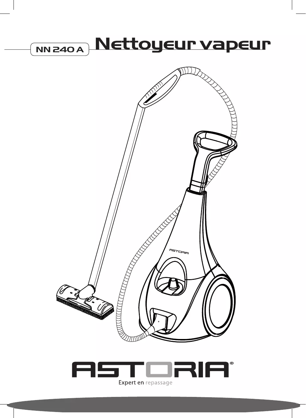Instructions d’utilisation NN 240 A Nettoyeur vapeur Avec cet appareil, vous avez fait l'acquisition d'un article de qualité, bénéficiant de toute l'expérience d'Astoria dans le domaine du petit électroménager. Il répond aux critères de la qualité Astoria : les meilleurs matériaux et composants ont été utilisés pour sa fabrication, et il a été soumis à des contrôles rigoureux. Nous souhaitons que son usage vous apporte entière satisfaction. Nous attirons votre attention sur le fait que cet appareil travaille avec de l'eau brûlante et de la vapeur sous pression. Nous vous demandons donc de lire très attentivement les instructions données dans cette notice, car elles fournissent, entre autres, des informations importantes relatives à la sécurité d'installation, d'utilisation et d'entretien. Gardez votre notice, vous pourriez avoir besoin de vous y référer dans le futur. Description produit