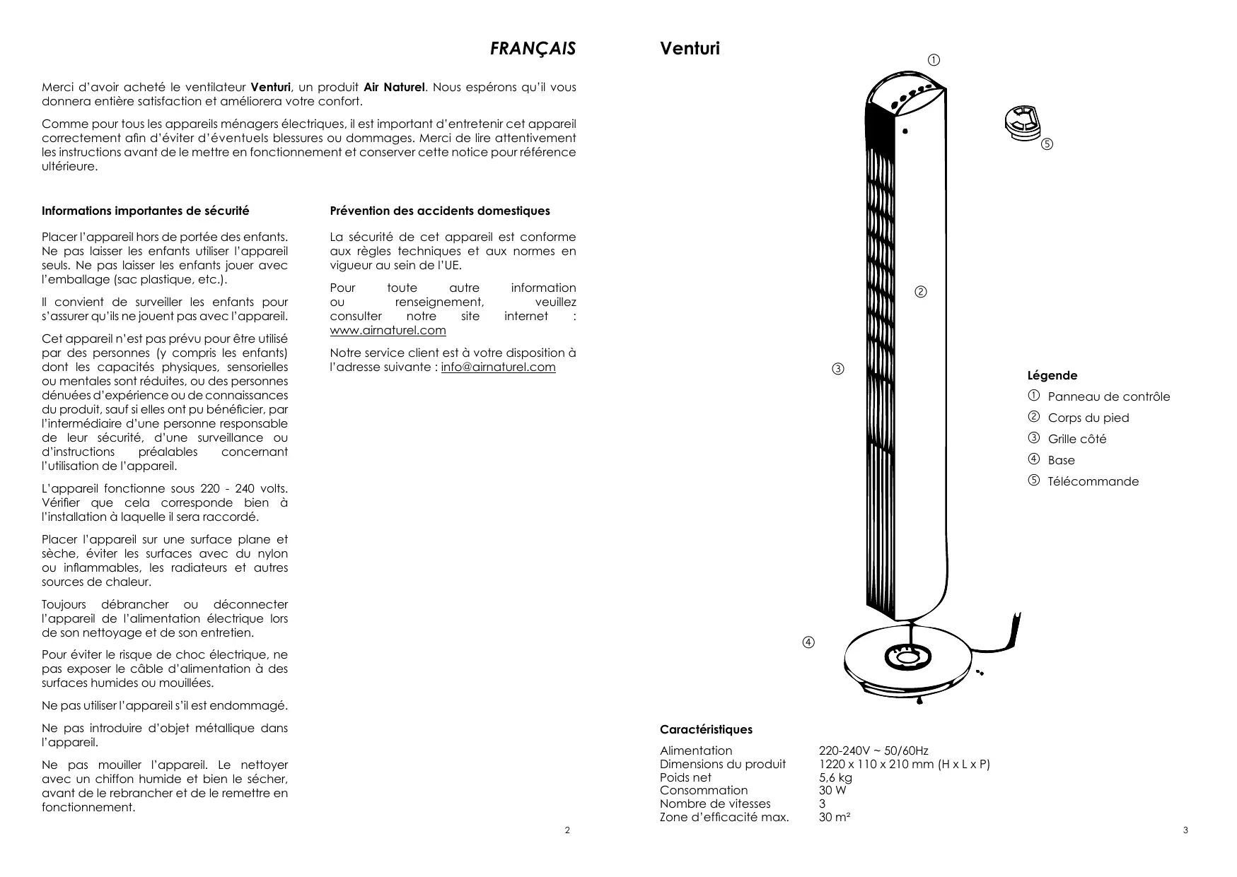 Merci d’avoir acheté le ventilateur Venturi, un produit Air Naturel. Nous espérons qu’il vous donnera entière satisfaction et améliorera votre confort. Comme pour tous les appareils ménagers électriques, il est important d’entretenir cet appareil correctement afin d’éviter d’éventuels blessures ou dommages. Merci de lire attentivement les instructions avant de le mettre en fonctionnement et conserver cette notice pour référence ultérieure. Informations importantes de sécurité Prévention des accidents domestiques Placer l’appareil hors de portée des enfants. Ne pas laisser les enfants utiliser l’appareil seuls. Ne pas laisser les enfants jouer avec l’emballage (sac plastique, etc.). La sécurité de cet appareil est conforme aux règles techniques et aux normes en vigueur au sein de l’UE. Il convient de surveiller les enfants pour s’assurer qu’ils ne jouent pas avec l’appareil. Cet appareil n’est pas prévu pour être utilisé par des personnes (y compris les enfants) dont les capacités physiques, sensorielles ou mentales sont réduites, ou des personnes dénuées d’expérience ou de connaissances du produit, sauf si elles ont pu bénéficier, par l’intermédiaire d’une personne responsable de leur sécurité, d’une surveillance ou d’instructions préalables concernant l’utilisation de l’appareil. Pour toute autre renseignement, consulter notre site www.airnaturel.com