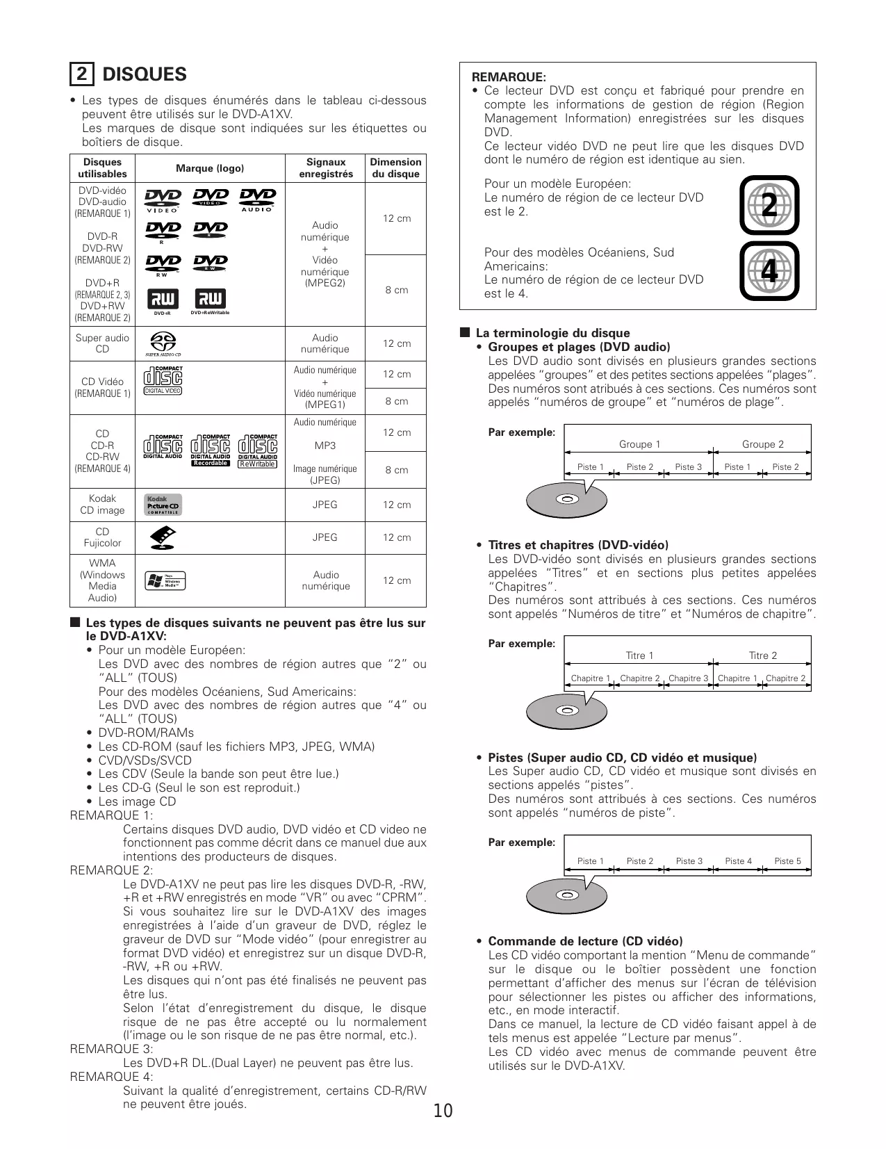 2 Les types de disques suivants ne peuvent pas être lus sur le DVD-A1XV: • Pour un modèle Européen: Les DVD avec des nombres de région autres que “2” ou “ALL” (TOUS) Pour des modèles Océaniens, Sud Americains: Les DVD avec des nombres de région autres que “4” ou “ALL” (TOUS) • DVD-ROM/RAMs • Les CD-ROM (sauf les fichiers MP3, JPEG, WMA) • CVD/VSDs/SVCD • Les CDV (Seule la bande son peut être lue.) • Les CD-G (Seul le son est reproduit.) • Les image CD REMARQUE 1: Certains disques DVD audio, DVD vidéo et CD video ne fonctionnent pas comme décrit dans ce manuel due aux intentions des producteurs de disques. REMARQUE 2: Le DVD-A1XV ne peut pas lire les disques DVD-R, -RW, +R et +RW enregistrés en mode “VR” ou avec “CPRM”. Si vous souhaitez lire sur le DVD-A1XV des images enregistrées à l’aide d’un graveur de DVD, réglez le graveur de DVD sur “Mode vidéo” (pour enregistrer au format DVD vidéo) et enregistrez sur un disque DVD-R, -RW, +R ou +RW. Les disques qui n’ont pas été finalisés ne peuvent pas être lus. Selon l’état d’enregistrement du disque, le disque risque de ne pas être accepté ou lu normalement (l’image ou le son risque de ne pas être normal, etc.). REMARQUE 3: Les DVD+R DL.(Dual Layer) ne peuvent pas être lus. REMARQUE 4: Suivant la qualité d’enregistrement, certains CD-R/RW ne peuvent être joués.