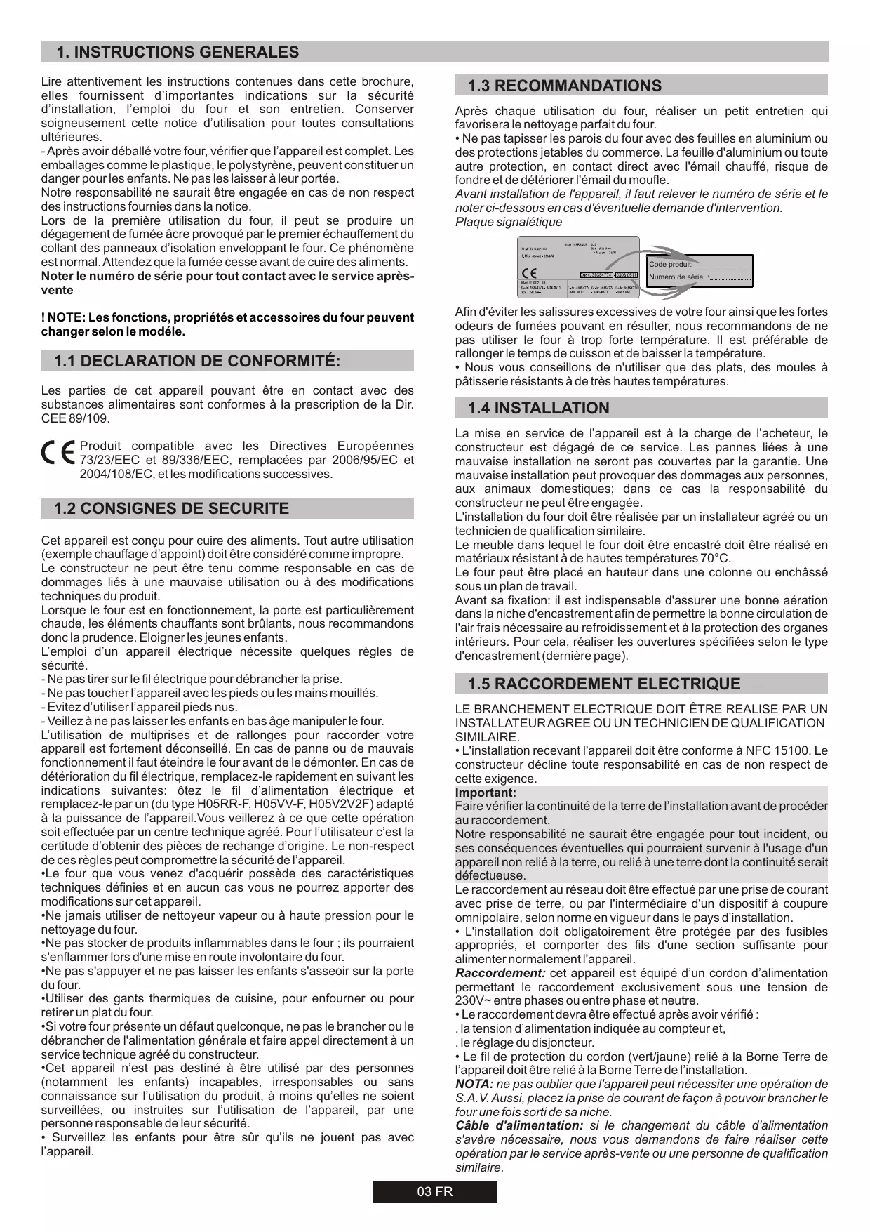 - Ne pas tapisser les parois du four avec des feuilles en aluminium ou des protections jetables du commerce. La feuille d'aluminium ou toute autre protection, en contact direct avec l'émail chauffé, risque de fondre et de détériorer l'émail du moufle. Avant installation de l'appareil, il faut relever le numéro de série et le noter ci-dessous en cas d'éventuelle demande d'intervention. Plaque signalétique Code produit: Numéro de série : Afin d'éviter les salissures excessives de votre four ainsi que les fortes odeurs de fumées pouvant en résulter, nous recommandons de ne pas utiliser le four à trop forte température. Il est préférable de rallonger le temps de cuisson et de baisser la température.