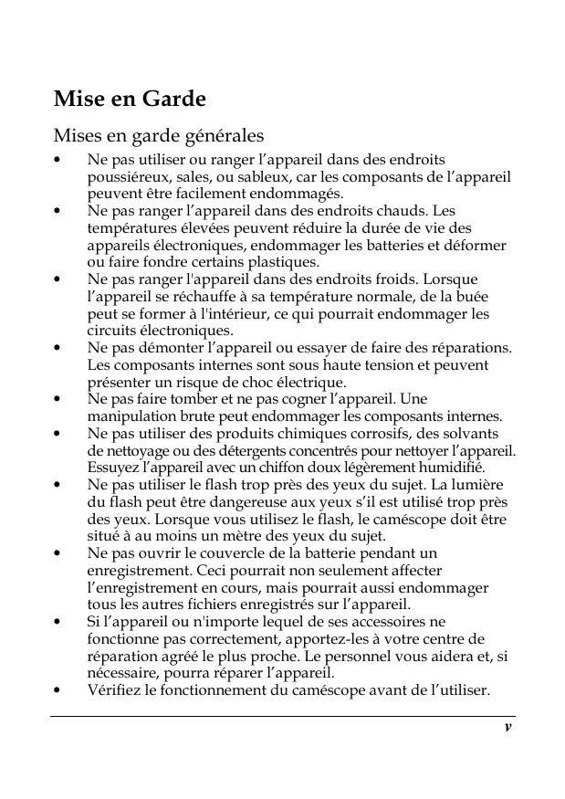 Ne pas utiliser ou ranger l’appareil dans des endroits poussiéreux, sales, ou sableux, car les composants de l’appareil peuvent être facilement endommagés. Ne pas ranger l’appareil dans des endroits chauds. Les températures élevées peuvent réduire la durée de vie des appareils électroniques, endommager les batteries et déformer ou faire fondre certains plastiques. Ne pas ranger l'appareil dans des endroits froids. Lorsque l’appareil se réchauffe à sa température normale, de la buée peut se former à l'intérieur, ce qui pourrait endommager les circuits électroniques. Ne pas démonter l’appareil ou essayer de faire des réparations. Les composants internes sont sous haute tension et peuvent présenter un risque de choc électrique. Ne pas faire tomber et ne pas cogner l’appareil. Une manipulation brute peut endommager les composants internes. Ne pas utiliser des produits chimiques corrosifs, des solvants de nettoyage ou des détergents concentrés pour nettoyer l’appareil. Essuyez l’appareil avec un chiffon doux légèrement humidifié. Ne pas utiliser le flash trop près des yeux du sujet. La lumière du flash peut être dangereuse aux yeux s’il est utilisé trop près des yeux. Lorsque vous utilisez le flash, le caméscope doit être situé à au moins un mètre des yeux du sujet. Ne pas ouvrir le couvercle de la batterie pendant un enregistrement. Ceci pourrait non seulement affecter l’enregistrement en cours, mais pourrait aussi endommager tous les autres fichiers enregistrés sur l’appareil. Si l’appareil ou n'importe lequel de ses accessoires ne fonctionne pas correctement, apportez-les à votre centre de réparation agréé le plus proche. Le personnel vous aidera et, si nécessaire, pourra réparer l’appareil. Vérifiez le fonctionnement du caméscope avant de l’utiliser.