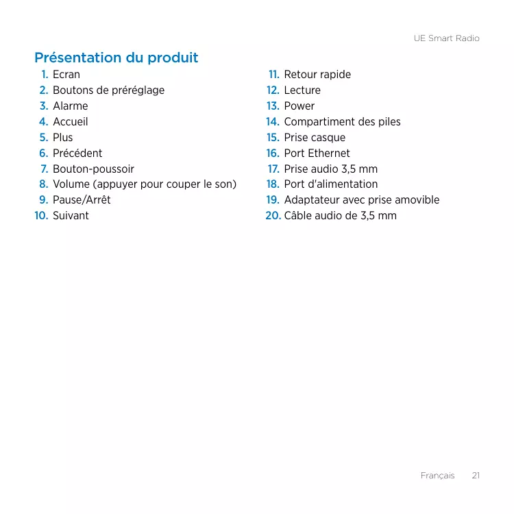 11. Retour rapide 12. Lecture 13. Power 14. Compartiment des piles 15. Prise casque 16. Port Ethernet 17. Prise audio 3,5 mm 18. Port d'alimentation 19. Adaptateur avec prise amovible 20. Câble audio de 3,5 mm