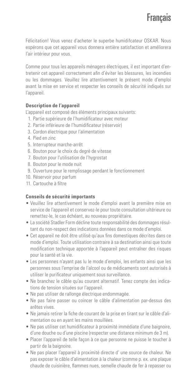 Félicitation! Vous venez d'acheter le superbe humidificateur OSKAR. Nous espérons que cet apparéil vous donnera entière satisfaction et améliorer a'air interieur pour vous.