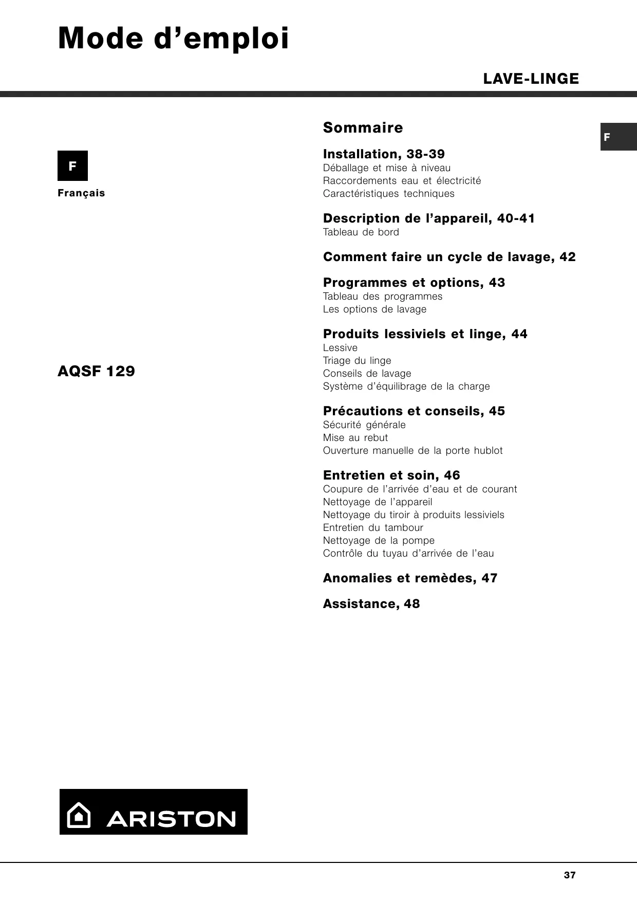 Installation, 38-39 Déballage et mise à niveau Raccordements eau et électricité Caractéristiques techniques Description de lappareil, 40-41 Tableau de bord Comment faire un cycle de lavage, 42 Programmes et options, 43 Tableau des programmes Les options de lavage Produits lessiviels et linge, 44 AQSF 129 Lessive Triage du linge Conseils de lavage Système déquilibrage de la charge Précautions et conseils, 45 Sécurité générale Mise au rebut Ouverture manuelle de la porte hublot Entretien et soin, 46 Coupure de larrivée deau et de courant Nettoyage de lappareil Nettoyage du tiroir à produits lessiviels Entretien du tambour Nettoyage de la pompe Contrôle du tuyau darrivée de leau Anomalies et remèdes, 47 Assistance, 48