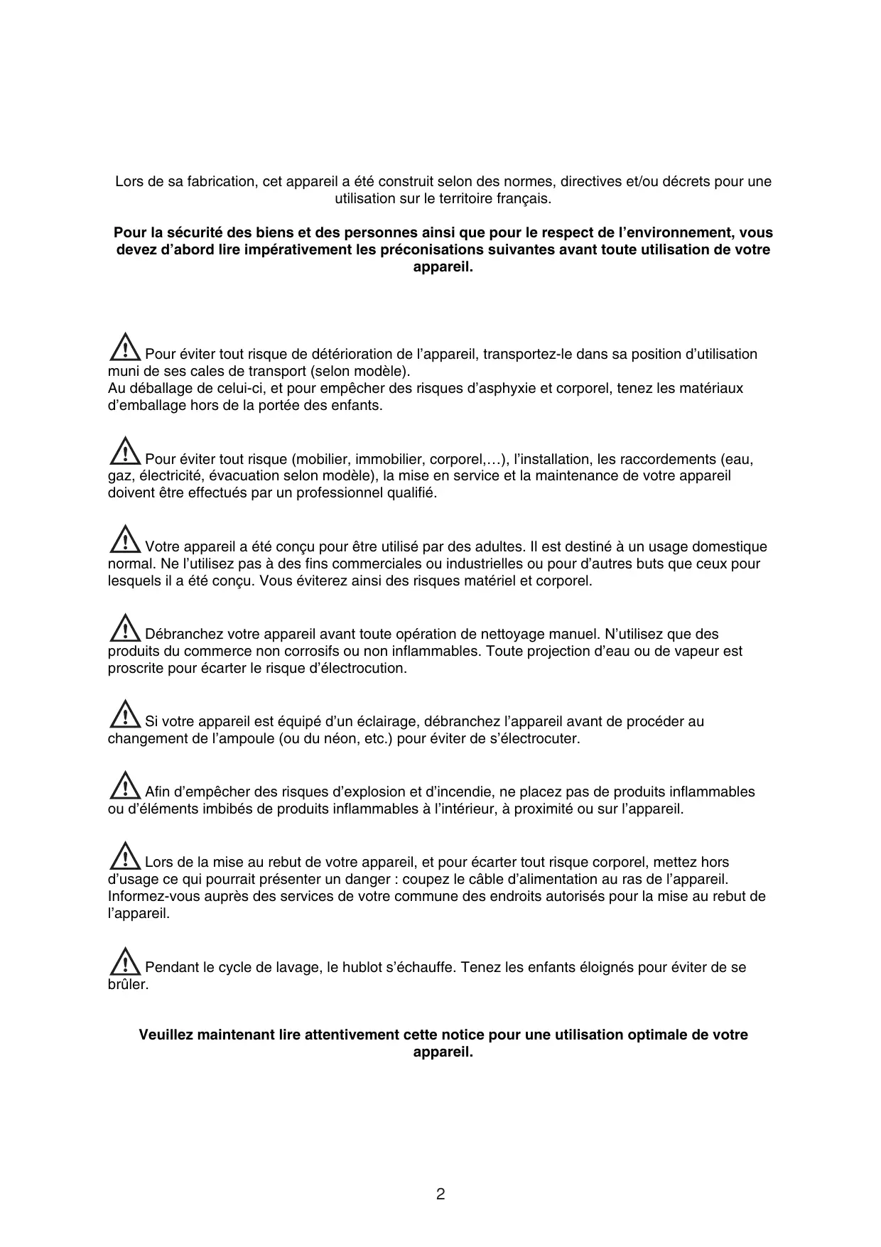 Pour éviter tout risque (mobilier, immobilier, corporel,…), l’installation, les raccordements (eau, gaz, électricité, évacuation selon modèle), la mise en service et la maintenance de votre appareil doivent être effectués par un professionnel qualifié.