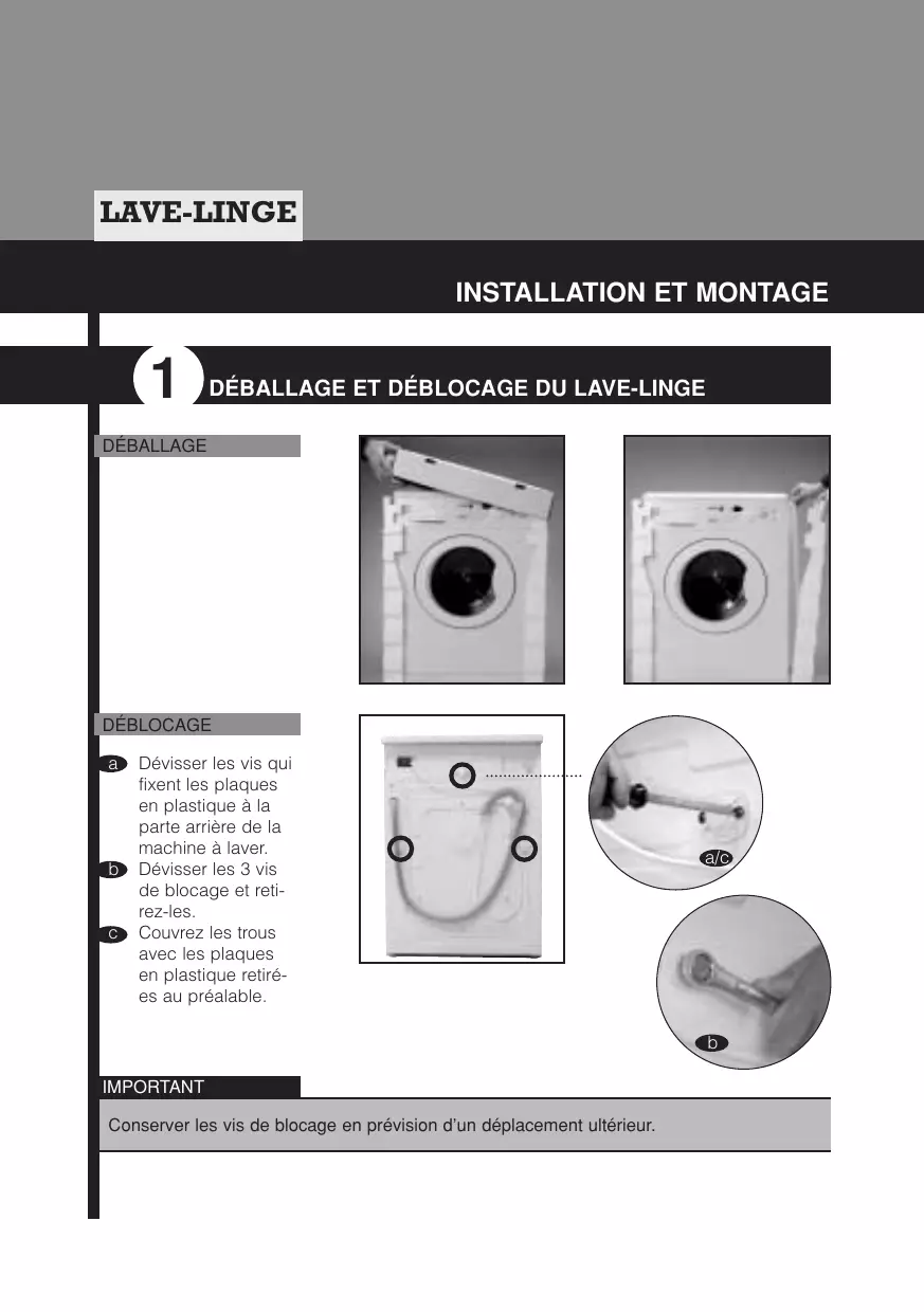 Dévisser les vis qui fixent les plaques en plastique à la parte arrière de la machine à laver. Dévisser les 3 vis de blocage et retirez-les. Couvrez les trous avec les plaques en plastique retirées au préalable. a/c