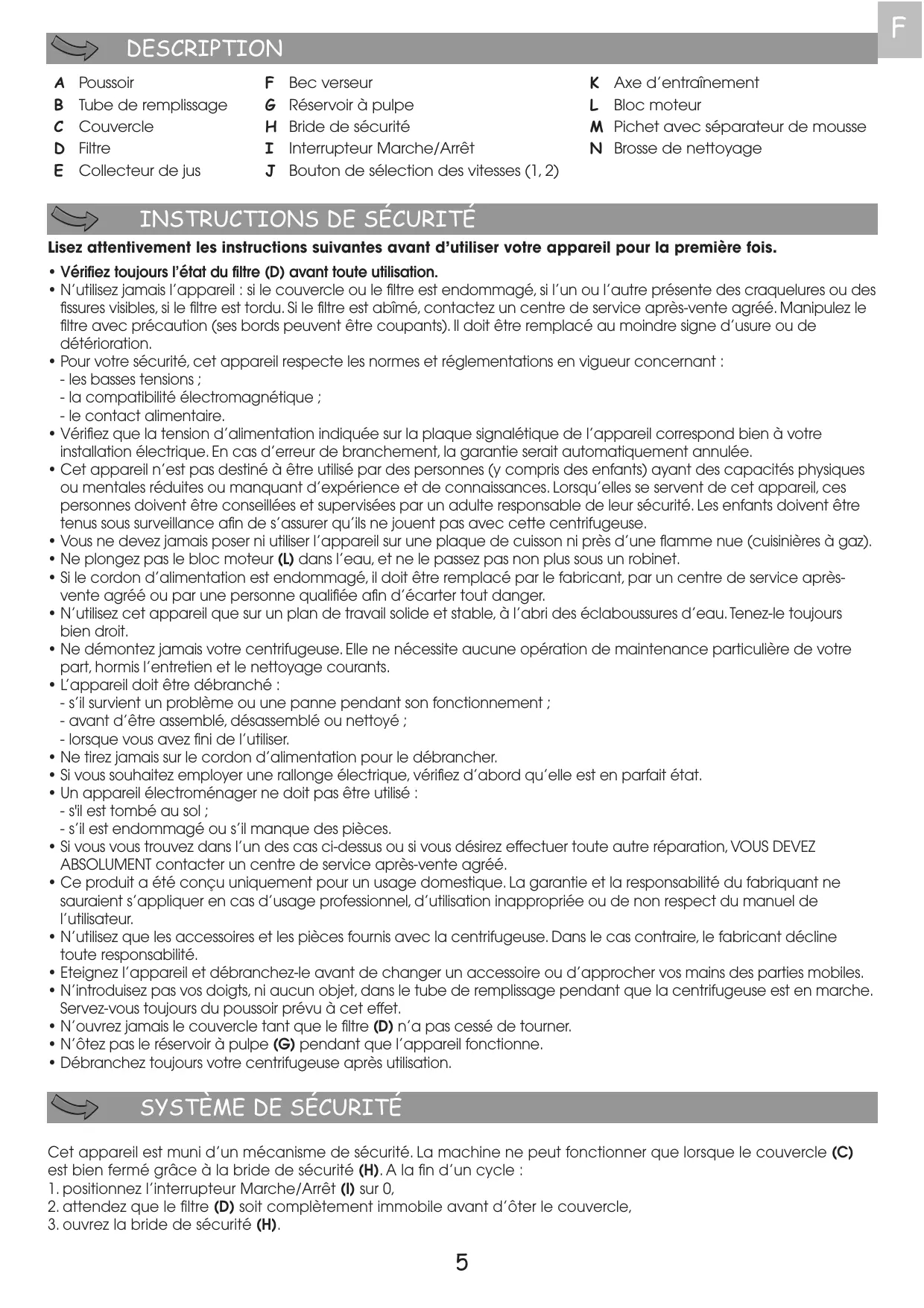 Cet appareil est muni d’un mécanisme de sécurité. La machine ne peut fonctionner que lorsque le couvercle (C) est bien fermé grâce à la bride de sécurité (H). A la fin d’un cycle :