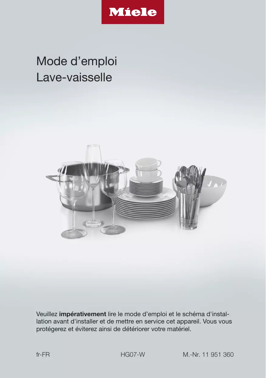 114 114 Lisez attentivement la notice de montage et le mode d'emploi avant d'installer ce lave-vaisselle et de le mettre en service. Ils vous fournissent des informations importantes sur la sécurité, l'utilisation et l'entretien de l'appareil. Vous éviterez ainsi de vous blesser et d'endommager votre lave-vaisselle. Conformément à la norme IEC 60335-1, Miele indique expressément de lire impérativement le chapitre pour l'installation du lavevaisselle et de suivre les consignes de sécurité et de mise en garde. Miele ne peut être tenu pour responsable des dommages dus au non-respect des consignes. Conservez la notice de montage et ce mode d'emploi et veuillez le remettre en cas de cession de cet appareil.
