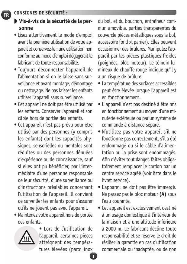 du bol, et du bouchon, entraîneur commun amovible, parties transparentes du couvercle pièces métalliques sous le bol, accessoire fond xl panier). Elles peuvent occasionner des brûlures. Manipulez l’appareil par les pièces plastiques froides (poignées, bloc moteur). Le témoin lumineux de chauffe rouge indique qu’il y a un risque de brûlure.