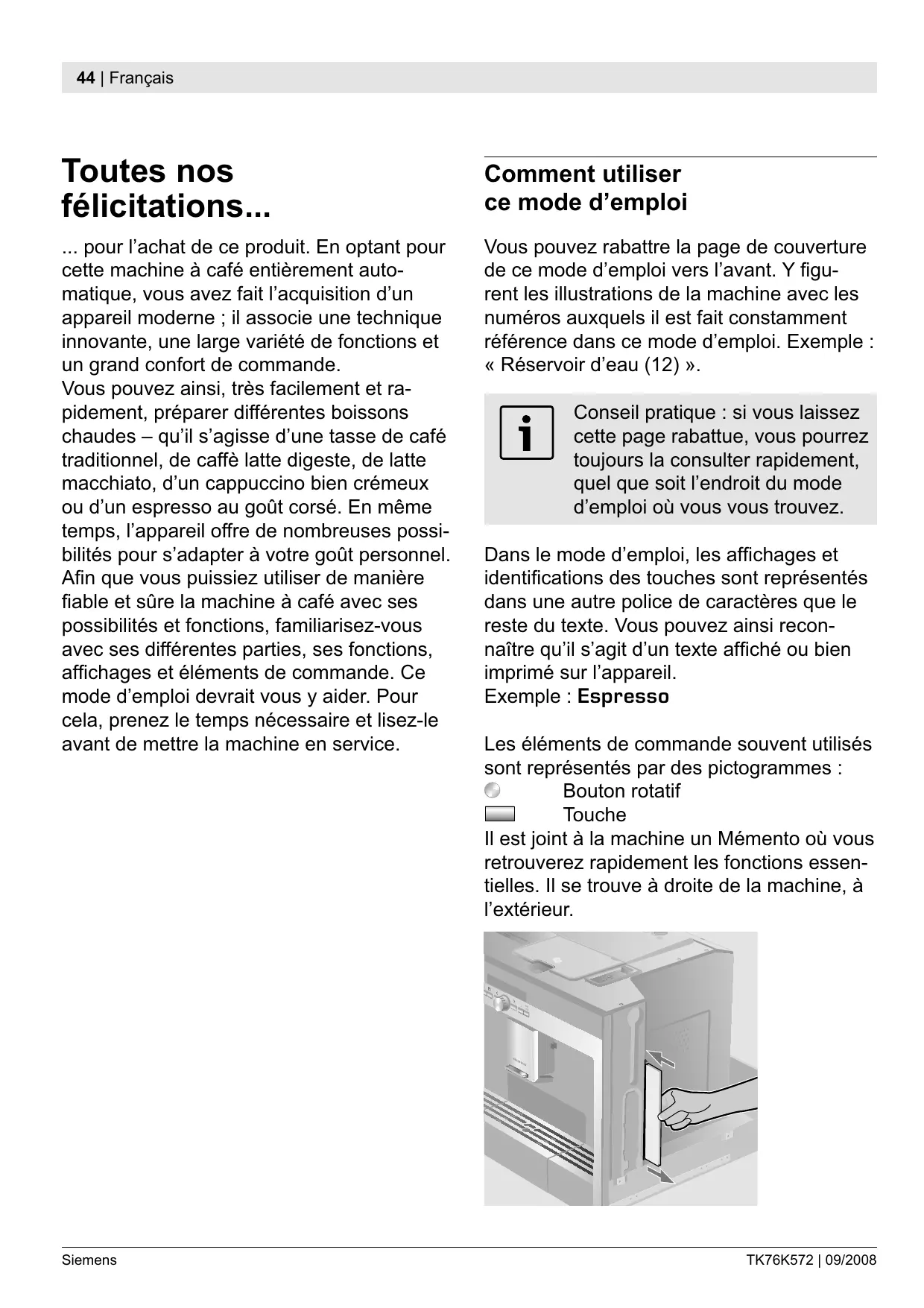 Les éléments de commande souvent utilisés sont représentés par des pictogrammes : Bouton rotatif Touche Il est joint à la machine un Mémento où vous retrouverez rapidement les fonctions essentielles. Il se trouve à droite de la machine, à l’extérieur.
