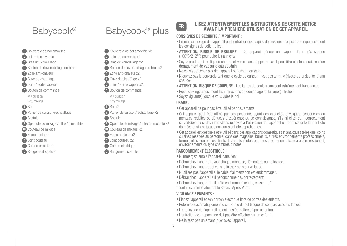 Nous vous remercions et vous félicitons pour votre choix : vous avez acquis un appareil aux performances uniques. Le BABYCOOK® a été conçu spécifiquement pour préparer sainement, simplement et rapidement les repas de votre bébé. BABYCOOK® cuit, réchauffe et décongèle les aliments à la vapeur en préservant leurs vitamines et assure un mixage parfait. ATTENTION, RISQUE DE BRULURE, pour ouvrir le bol après cuisson, appuyer sur le bouton du bras en évitant de toucher le couvercle qui est chaud. Fig 13
