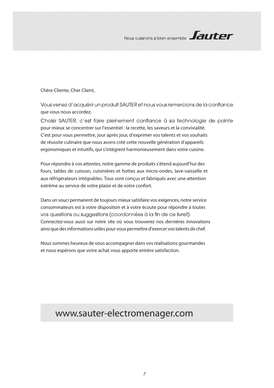 Chère Cliente, Cher Client, que vous nous accordez. pour mieux se concentrer sur l’essentiel : la recette, les saveurs et la convivialité. C’est pour vous permettre, jour après jour, d’exprimer vos talents et vos souhaits de réussite culinaire que nous avons créé cette nouvelle génération d’appareils ergonomiques et intuitifs, qui s’intègrent harmonieusement dans votre cuisine. Pour répondre à vos attentes, notre gamme de produits s’étend aujourd’hui des fours, tables de cuisson, cuisinières et hottes aux micro-ondes, lave-vaisselle et aux réfrigérateurs intégrables. Tous sont conçus et fabriqués avec une attention extrême au service de votre plaisir et de votre confort. Dans un souci permanent de toujours mieux satisfaire vos exigences, notre service consommateurs est à votre disposition et à votre écoute pour répondre à toutes Connectez-vous aussi sur notre site où vous trouverez nos dernières innovations ainsi que des informations utiles pour vous permettre d’exercer vos talents de chef. Nous sommes heureux de vous accompagner dans vos réalisations gourmandes et nous espérons que votre achat vous apporte entière satisfaction. www.sauter-electromenager.com