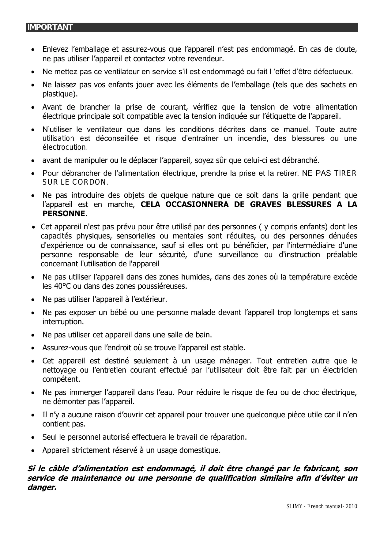 Si le câble d’alimentation est endommagé, il doit être changé par le fabricant, son service de maintenance ou une personne de qualification similaire afin d’éviter un danger. SLIMY - French manual- 2010