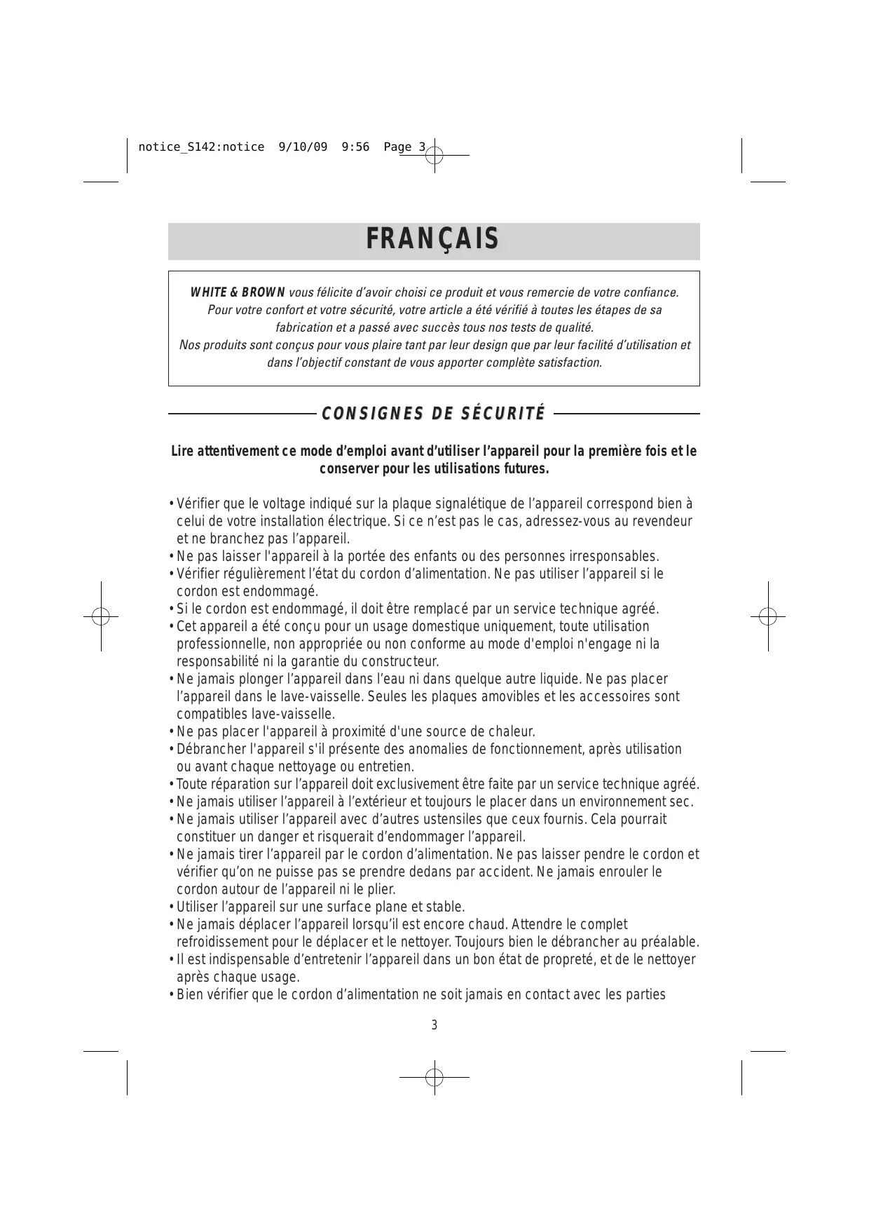 USER MANUAL notice_S142:notice 9/10/09 9:56 Page 3 FRANÇAIS WHITE & BROWN vous félicite d’avoir choisi ce produit et vous remercie de votre confiance. Pour votre confort et votre sécurité, votre article a été vérifié à toutes les étapes de sa fabrication et a passé avec succès tous nos tests de qualité. Nos produits sont conçus pour vous plaire tant par leur design que par leur facilité d’utilisation et dans l’objectif constant de vous apporter complète satisfaction.