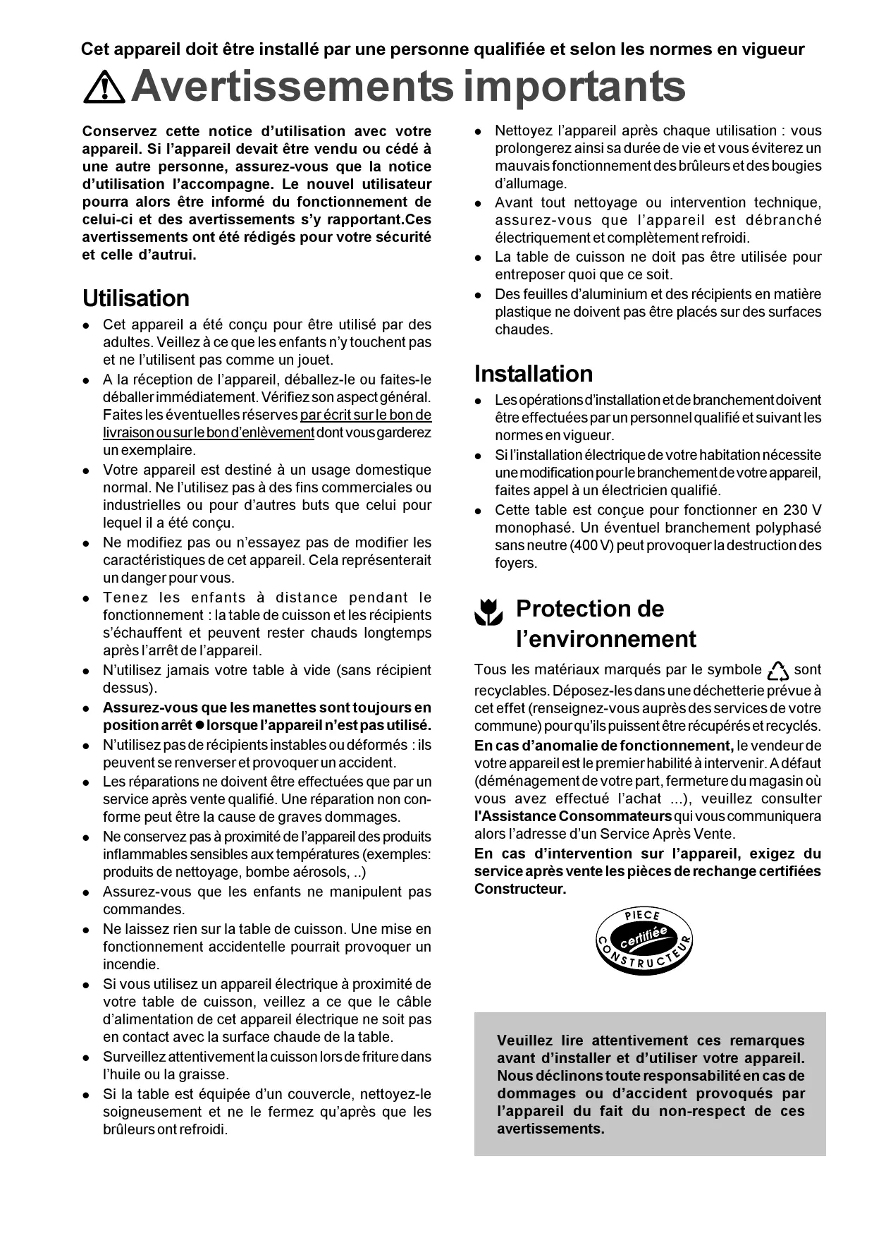 Les opérations dinstallation et de branchement doivent être effectuées par un personnel qualifié et suivant les normes en vigueur. Si linstallation électrique de votre habitation nécessite une modification pour le branchement de votre appareil, faites appel à un électricien qualifié. Cette table est conçue pour fonctionner en 230 V monophasé. Un éventuel branchement polyphasé sans neutre (400 V) peut provoquer la destruction des foyers. Protection de lenvironnement Tous les matériaux marqués par le symbole sont recyclables. Déposez-les dans une déchetterie prévue à cet effet (renseignez-vous auprès des services de votre commune) pour quils puissent être récupérés et recyclés. En cas danomalie de fonctionnement, le vendeur de votre appareil est le premier habilité à intervenir. A défaut (déménagement de votre part, fermeture du magasin où vous avez effectué lachat ...), veuillez consulter l'Assistance Consommateurs qui vous communiquera alors ladresse dun Service Après Vente. En cas dintervention sur lappareil, exigez du service après vente les pièces de rechange certifiées Constructeur. Veuillez lire attentivement ces remarques avant dinstaller et dutiliser votre appareil. Nous déclinons toute responsabilité en cas de dommages ou daccident provoqués par lappareil du fait du non-respect de ces avertissements. Sommaire A l'attention de l'installateur A l'attention de l'utilisateur Avertissements importants