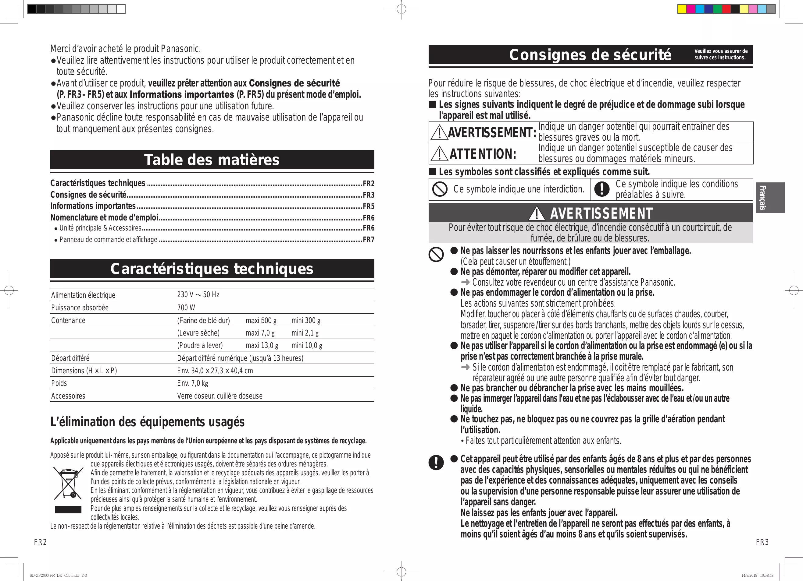 Caractéristiques techniques FR2 Consignes de sécurité FR3 Informations importantes FR5 Nomenclature et mode d’emploi FR6