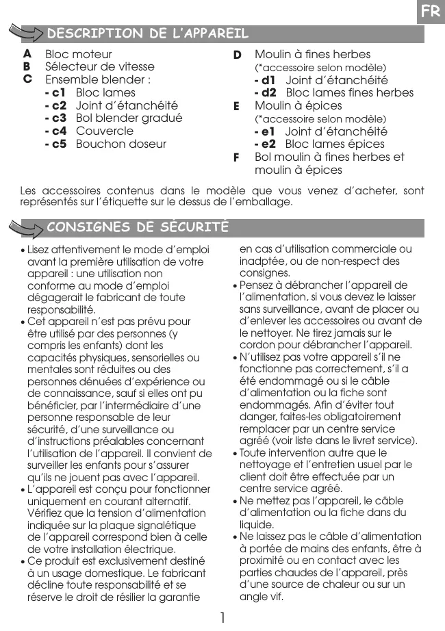 FR NL EN DE ES IT PT DA SV NO FI EL TR AR FA TH FR DESCRIPTION DE L’APPAREIL A B C Bloc moteur Sélecteur de vitesse Ensemble blender : - c1 Bloc lames - c2 Joint d’étanchéité - c3 Bol blender gradué - c4 Couvercle - c5 Bouchon doseur