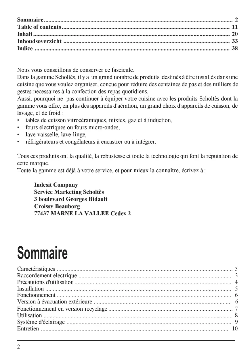 - Nous vous conseillons de conserver ce fascicule. Dans la gamme Scholtès, il y a un grand nombre de produits destinés à être installés dans une cuisine que vous voulez organiser, conçue pour réduire des centaines de pas et des milliers de gestes nécessaires à la confection des repas quotidiens. Aussi, pourquoi ne pas continuer à équiper votre cuisine avec les produits Scholtès dont la gamme vous offre, en plus des appareils d'aération, un grand choix d'appareils de cuisson, de lavage, et de froid : tables de cuisson vitrocéramiques, mixtes, gaz et à induction, fours électriques ou fours micro-ondes, lave-vaisselle, lave-linge, réfrigérateurs et congélateurs à encastrer ou à intégrer. Tous ces produits ont la qualité, la robustesse et toute la technologie qui font la réputation de cette marque. Toute la gamme est déjà à votre service, et pour mieux la connaître, écrivez à : Indesit Company Service Marketing Scholtès 3 boulevard Georges Bidault Croissy Beauborg 77437 MARNE LA VALLEE Cedex 2 Sommaire Caractéristiques p. 3