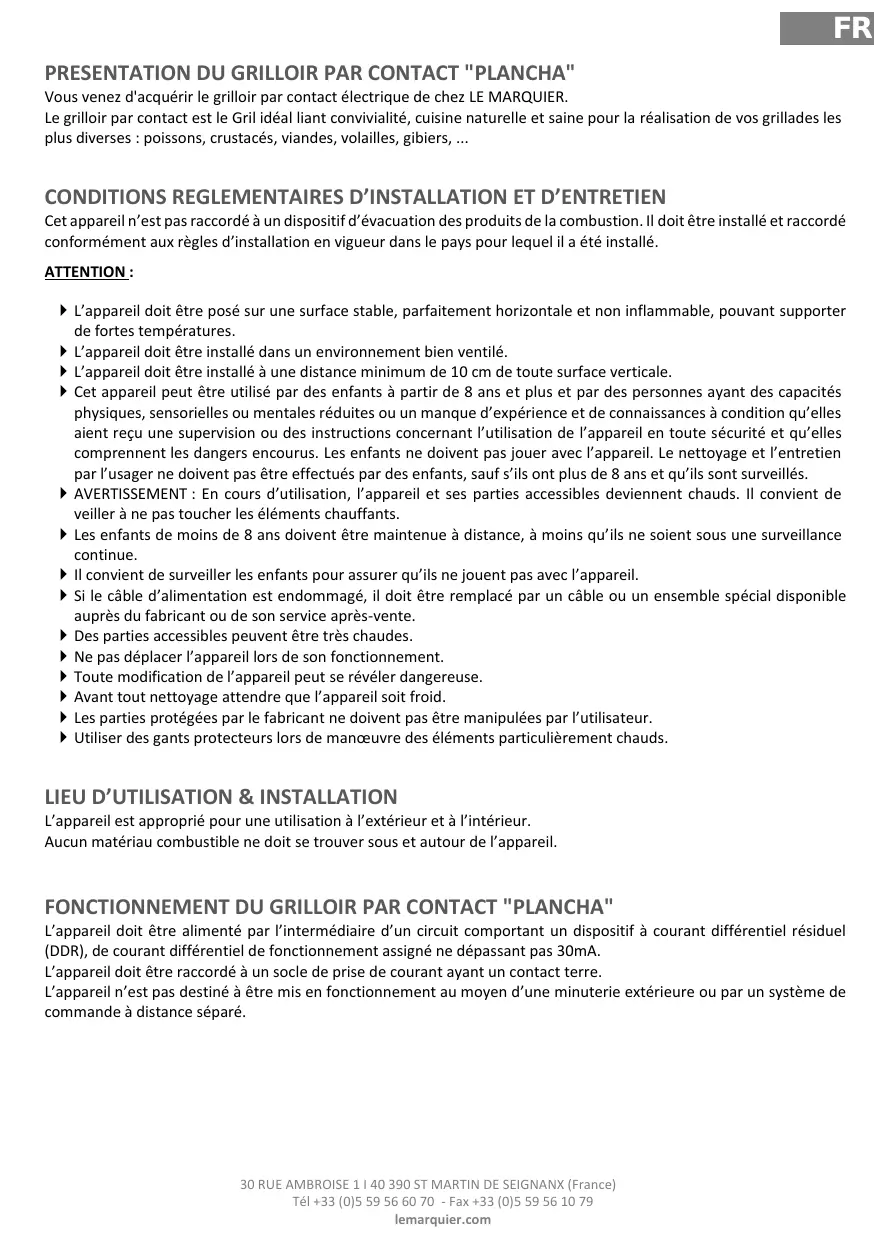 Tél +33 (0)5 59 56 60 70 - Fax +33 (0)5 59 56 10 79 lemarquier.com 3. Lorsque la surface de cuisson atteint la température réglée, la plancha s’arrête de chauffer et le voyant blanc s’éteint automatiquement. Le voyant blanc s’allume à nouveau lorsque la température de la plaque de fonte est inférieure à celle réglée sur le thermostat. L’appareil fonctionnera en s’activant et se désactivant, afin de maintenir la température réglée et souhaitée par l’utilisateur. 4. Vous pouvez régler la température désirée de 0 à 300°C lors de la cuisson. 5. Avant toute cuisson, préchauffer la plancha environ 10 minutes sur la position 300°C. 6. Après chaque cuisson, positionner le bouton du thermostat sur 0 et déconnecter l’alimentation électrique. 7. Lorsque vous ne vous servez plus de votre plancha, stocker la dans un endroit sec. REMARQUE : Vous pouvez récupérer les jus de la cuisson de vos aliments à l’aide du récupérateur situé à l’avant de votre plancha.