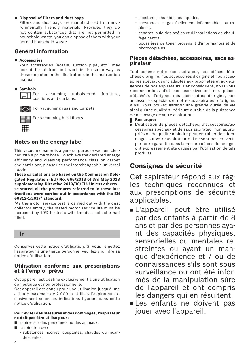 Notes on the energy label This vacuum cleaner is a general purpose vacuum cleaner with a primary hose. To achieve the declared energy efficiency and cleaning performance class on carpet and hard floor, please use the interchangeable universal nozzle. These calculations are based on the Commission Delegated Regulation (EU) No. 665/2013 of 3rd May 2013 supplementing Directive 2010/30/EU. Unless otherwise stated, all the procedures referred to in these instructions were carried out in accordance with the EN 60312-1:2017* standard. *As the motor service test is carried out with the dust collector empty, the stated motor service life must be increased by 10% for tests with the dust collector half filled.