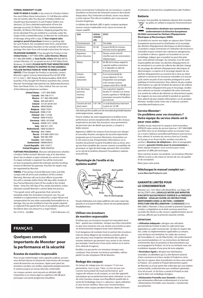 - Our goods come with guarantees that cannot be excluded under the Australian Consumer Law. You are entitled to a replacement or refund for a major failure and compensation for any other reasonably foreseeable loss or damage. You are also entitled to have the goods repaired or replaced if the goods fail to be of acceptable quality and the failure does not amount to a major failure. Ver.121912 – GLOBAL ©2014 Monster, LLC FRANÇAIS Quelques conseils importants de Monster® pour la performance et la sécurité Écoutez de manière responsable Pour ne pas endommager votre capacité auditive, assurezvous de bien baisser le volume de votre lecteur de musique avant de brancher vos écouteurs. Après avoir placé les écouteurs sur/dans vos oreilles, augmentez progressivement le volume jusqu’à un niveau d’écoute confortable. Les niveaux sonores sont mesurés en décibels (dB). L’exposition à un niveau égal ou supérieur à 85 dB peut provoquer une perte progressive d’audition. Gérez correctement l’utilisation de vos écouteurs. La perte d’audition est fonction de l’intensité sonore et de la durée d’exposition. Plus l’intensité est élevée, moins vous devez y rester exposé. Plus elle est modérée, plus vous pouvez écouter longtemps. Le tableau des décibels (dB) ci-après compare quelques sources sonores habituelles et les classe en termes de risques auditifs. SON NIVEAU EFFET SONORE (dB) Chuchotement