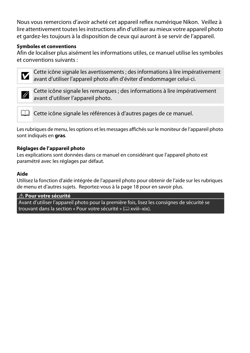 Les explications sont données dans ce manuel en considérant que l’appareil photo est paramétré avec les réglages par défaut. Aide Utilisez la fonction d’aide intégrée de l’appareil photo pour obtenir de l’aide sur les rubriques de menu et d’autres sujets. Reportez-vous à la page 18 pour en savoir plus. A Pour votre sécurité Avant d’utiliser l’appareil photo pour la première fois, lisez les consignes de sécurité se trouvant dans la section « Pour votre sécurité » (0 xviii–xix).