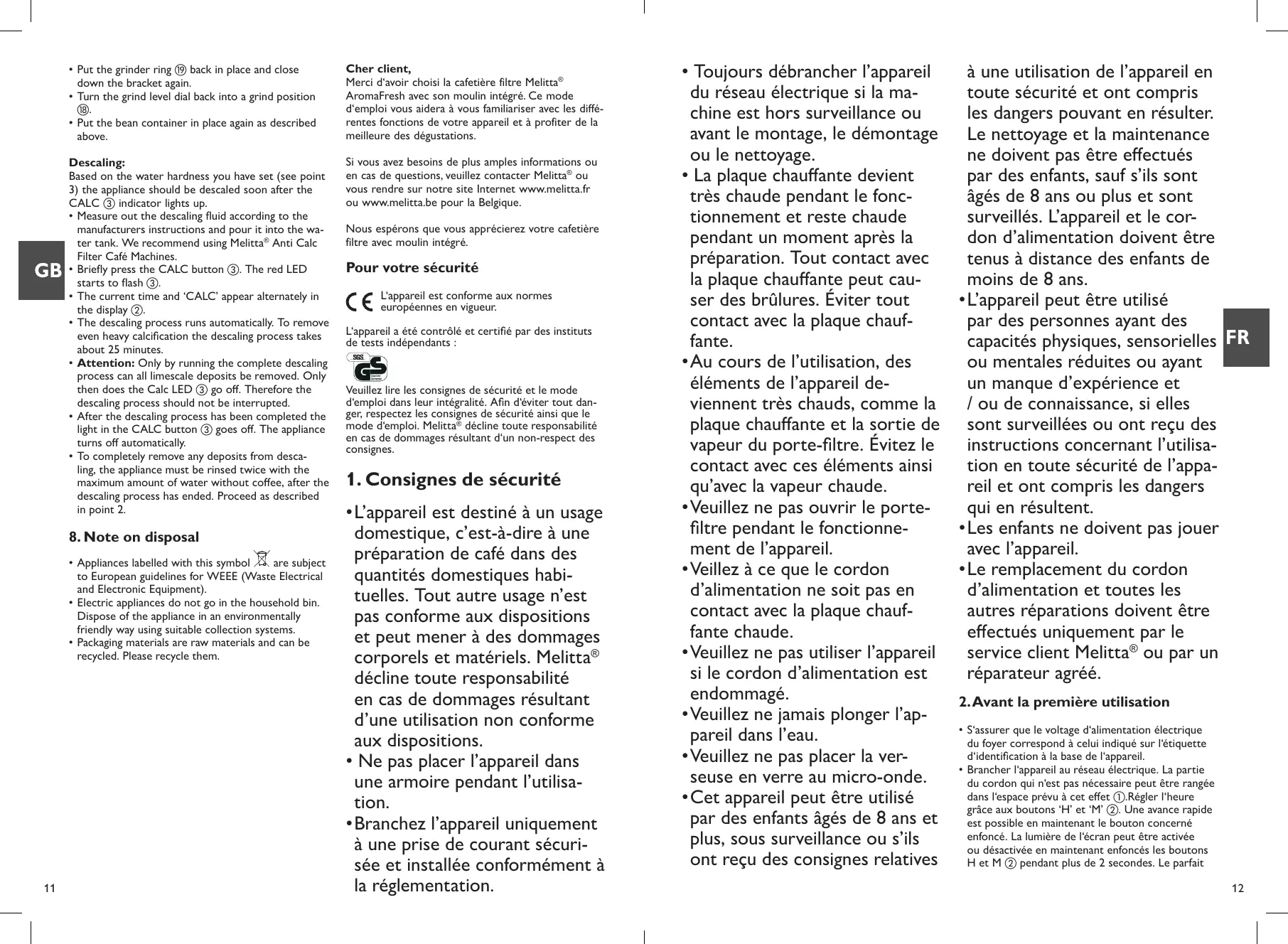 Nous espérons que vous apprécierez votre cafetière filtre avec moulin intégré. Pour votre sécurité L‘appareil est conforme aux normes européennes en vigueur. L‘appareil a été contrôlé et certifié par des instituts de tests indépendants : Veuillez lire les consignes de sécurité et le mode d‘emploi dans leur intégralité. Afin d‘éviter tout danger, respectez les consignes de sécurité ainsi que le mode d‘emploi. Melitta® décline toute responsabilité en cas de dommages résultant d‘un non-respect des consignes.