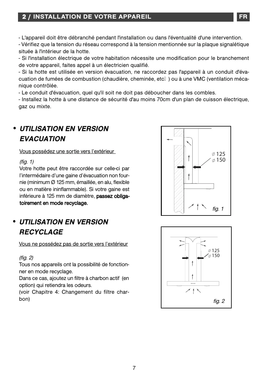 (fig. 1) Votre hotte peut être raccordée sur celle-ci par l’intermédaire d’une gaine d’évacuation non fournie (minimum Ø 125 mm, émaillée, en alu, flexible ou en matière ininflammable). Si votre gaine est inférieure à 125 mm de diamètre, passez obligatoirement en mode recyclage. fig. 1