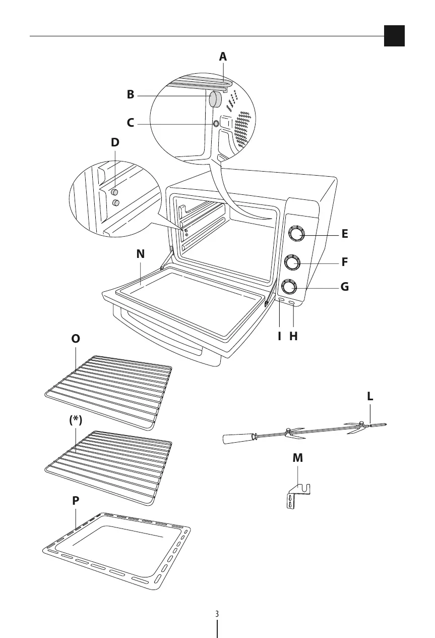 • Ne mettez jamais de papier, carton ou plastique dans le four et ne posez jamais rien dessus (ustensiles, grilles ou autres objets). • N’introduisez rien dans les bouches de ventilation. Veillez à ne pas les obstruer. • Ce four n’est pas conçu pour être encastré. • Une fois la porte ouverte, n’y appuyez jamais des objets lourds, des casseroles ou récipients brûlants. Ne tirez pas la poignée vers le bas. • La responsabilité du fabricant ne sera pas engagée en cas d’usage professionnel, non approprié ou non conforme au mode d’emploi, et la garantie sera annulée. • Cet appareil est destiné à un usage exclusivement domestique. Il n’est pas conçu pour travailler dans des les cuisines réservées au personnel des magasins, bureaux et autres environnement professionnels, dans les gîtes ruraux, hôtels, motels et autres structures d’accueil, les meublés ou chambres d’hôtes. • Débranchez toujours l’appareil avant de le nettoyer et lorsque vous ne l’utilisez pas. • Ne pas faire fonctionner l’appareil à l’aide d’une minuterie ou d’un système de commande à distance séparés. • L’appareil doit être installé dos au mur. • Évitez de nettoyer le moule de pétrissage avec des objets métalliques pointus ou coupants. • Éteignez toujours l’appareil en plaçant la minuterie sur « 0 » et débranchez la fiche de la prise après utilisation et avant tout nettoyage.