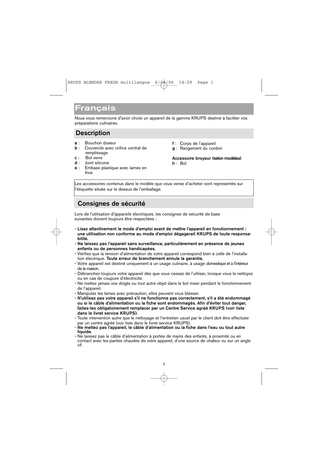 Page a3 KRUPS BLENDER FRESH multilangue 6/04/06 14:29 Page 1 Français Nous vous remercions d'avoir choisi un appareil de la gamme KRUPS destiné à faciliter vos préparations culinaires. Description