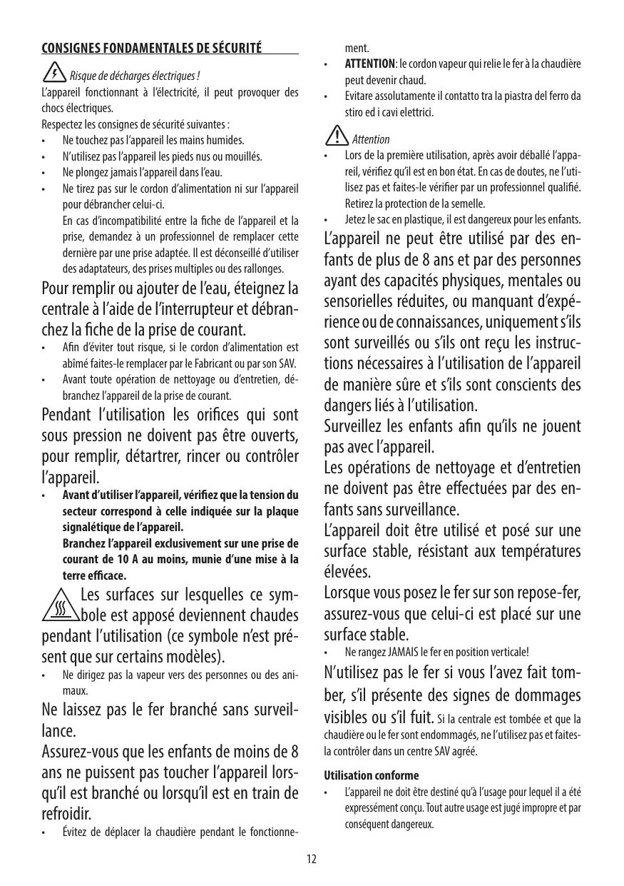 - ATTENTION: le cordon vapeur qui relié le fer à la chaudière peut devenir chaud.