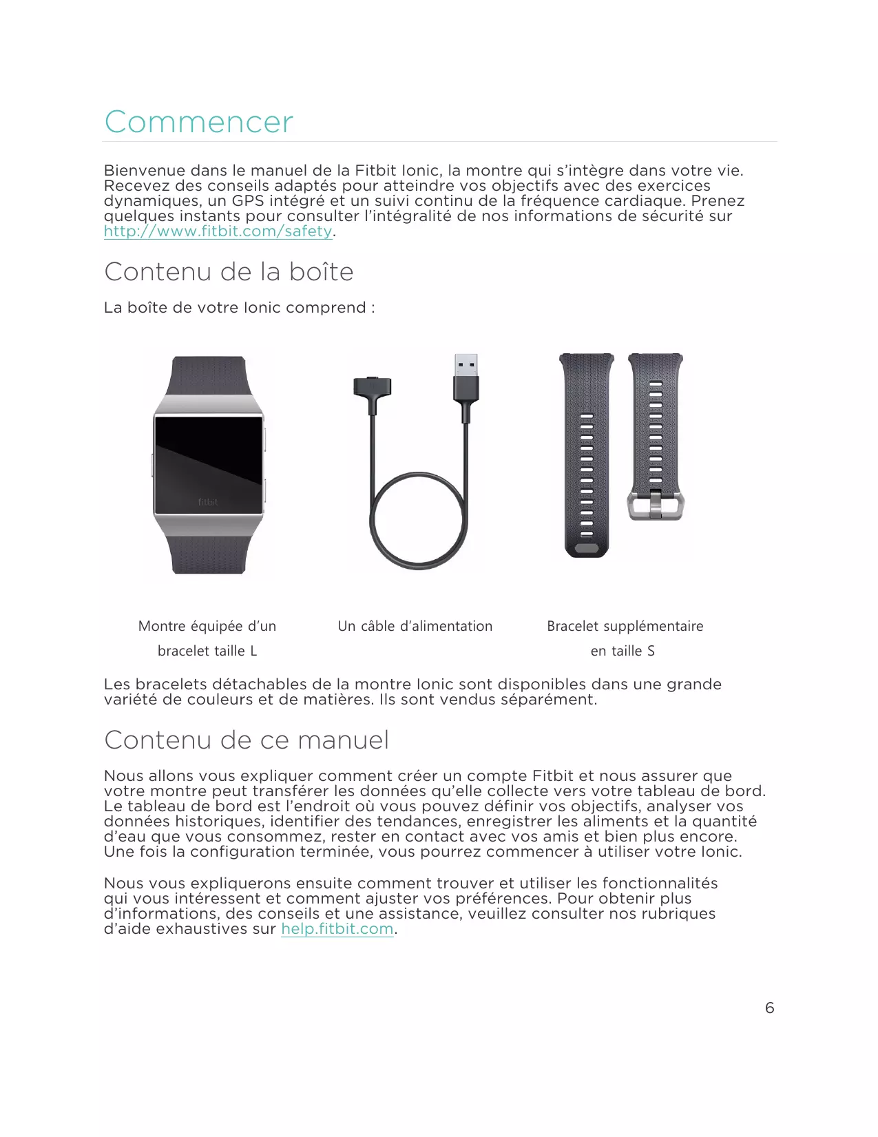 Commencer Bienvenue dans le manuel de la Fitbit Ionic, la montre qui s’intègre dans votre vie. Recevez des conseils adaptés pour atteindre vos objectifs avec des exercices dynamiques, un GPS intégré et un suivi continu de la fréquence cardiaque. Prenez quelques instants pour consulter l’intégralité de nos informations de sécurité sur http://www.fitbit.com/safety. Contenu de la boîte La boîte de votre Ionic comprend : Montre équipée d’un Un câble d’alimentation bracelet taille L Bracelet supplémentaire en taille S Les bracelets détachables de la montre Ionic sont disponibles dans une grande variété de couleurs et de matières. Ils sont vendus séparément. Contenu de ce manuel Nous allons vous expliquer comment créer un compte Fitbit et nous assurer que votre montre peut transférer les données qu’elle collecte vers votre tableau de bord. Le tableau de bord est l’endroit où vous pouvez définir vos objectifs, analyser vos données historiques, identifier des tendances, enregistrer les aliments et la quantité d’eau que vous consommez, rester en contact avec vos amis et bien plus encore. Une fois la configuration terminée, vous pourrez commencer à utiliser votre Ionic. Nous vous expliquerons ensuite comment trouver et utiliser les fonctionnalités qui vous intéressent et comment ajuster vos préférences. Pour obtenir plus d’informations, des conseils et une assistance, veuillez consulter nos rubriques d’aide exhaustives sur help.fitbit.com.