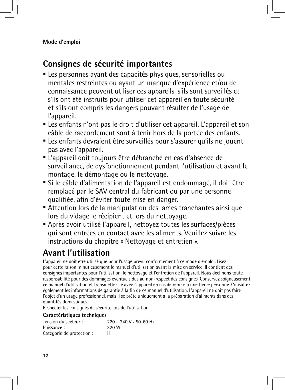 - ▪Après avoir utilisé l’appareil, nettoyez toutes les surfaces/pièces qui sont entrées en contact avec les aliments. Veuillez suivre les instructions du chapitre « Nettoyage et entretien ». Avant l’utilisation L’appareil ne doit être utilisé que pour l’usage prévu conformément à ce mode d’emploi. Lisez pour cette raison minutieusement le manuel d’utilisation avant la mise en service. Il contient des consignes importantes pour l’utilisation, le nettoyage et l’entretien de l’appareil. Nous déclinons toute responsabilité pour des dommages éventuels dus au non-respect des consignes. Conservez soigneusement ce manuel d’utilisation et transmettez-le avec l’appareil en cas de remise à une tierce personne. Consultez également les informations de garantie à la fin de ce manuel d’utilisation. L’appareil ne doit pas faire l’objet d’un usage professionnel, mais il se prête uniquement à la préparation d’aliments dans des quantités domestiques. Respecter les consignes de sécurité lors de l’utilisation. Caractéristiques techniques Tension du secteur : Puissance : Catégorie de protection :