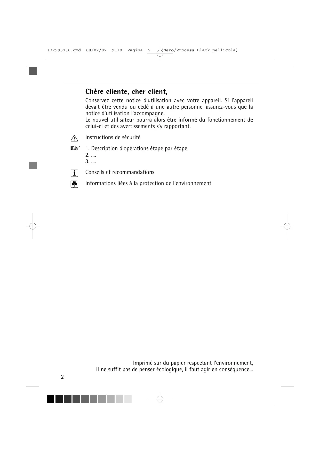 (Nero/Process Black pellicola) Chère cliente, cher client, Conservez cette notice d'utilisation avec votre appareil. Si l'appareil devait être vendu ou cédé à une autre personne, assurez-vous que la notice d'utilisation l'accompagne. Le nouvel utilisateur pourra alors être informé du fonctionnement de celui-ci et des avertissements s'y rapportant. Instructions de sécurité